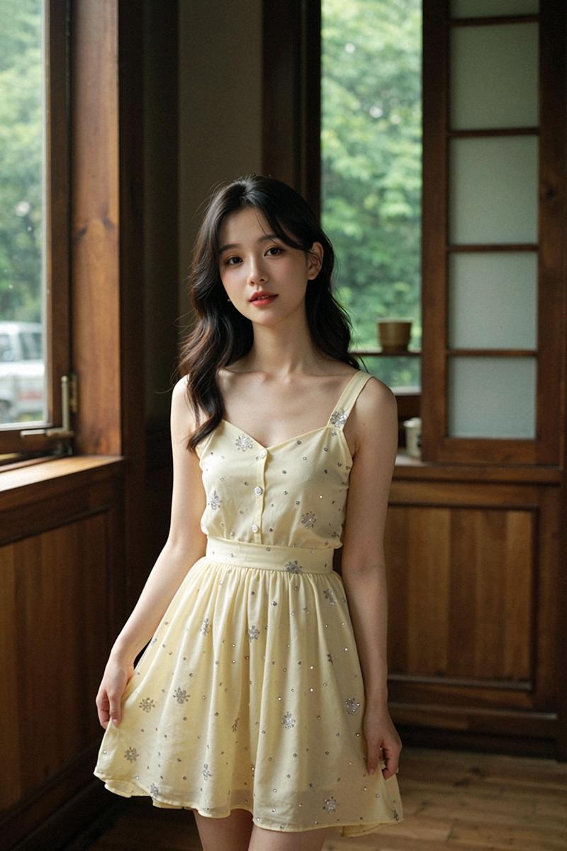 夏日清新风,少女心满满,复古木窗前,甜美连衣裙,自然光下,温柔动人。