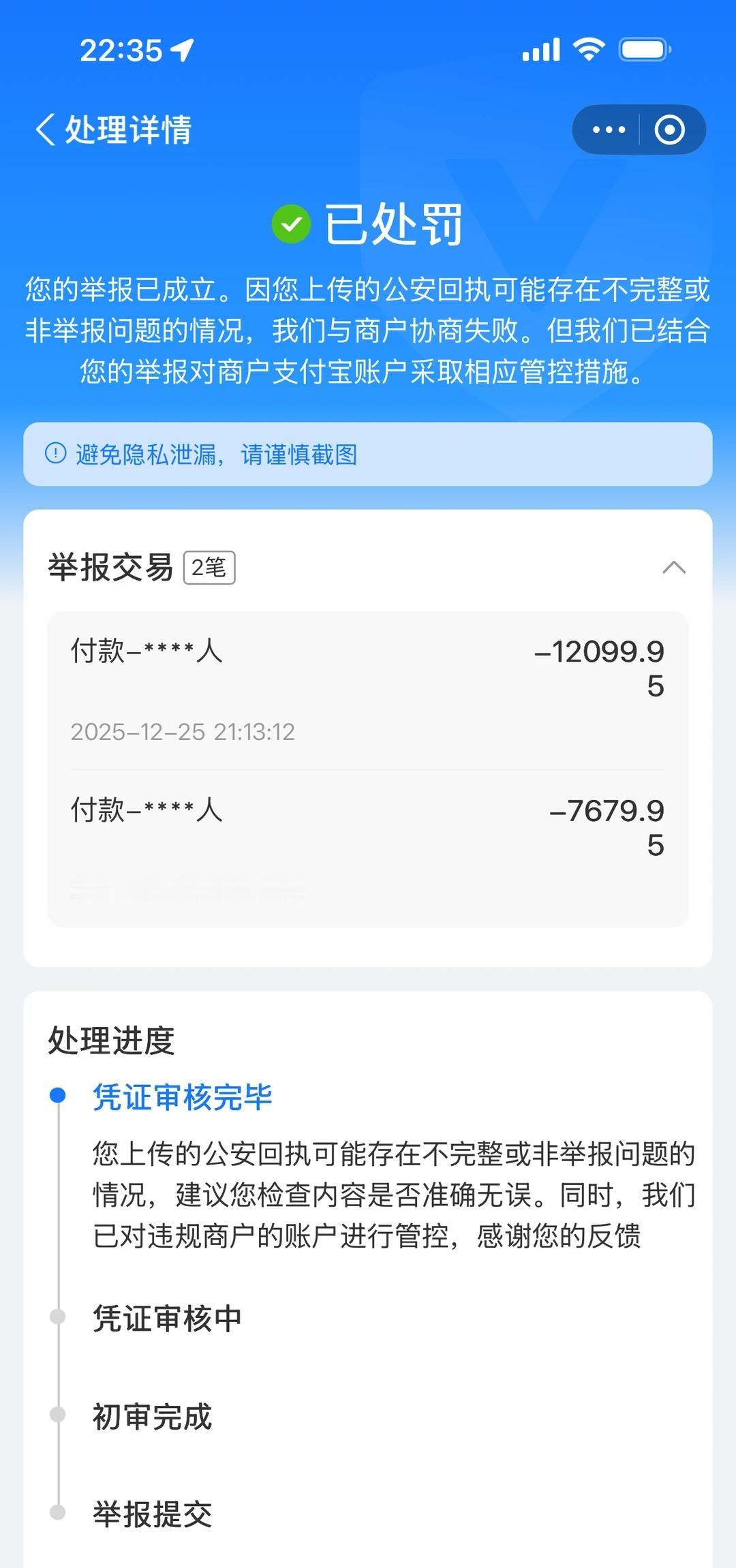 被电信诈骗,支付宝投诉举报,为什么两个结果 我是在家无聊又挣钱心切,于是进了刷单组织,具体的过程我想开个新帖子一点点说,以帮助、救助更多的人引以为戒,不要被骗。 言归正传,总之就是被骗子骗刷单虚拟游戏装备,有一些在闲🐟上成为正当交易了,没办法了,有一些是直接转账给个人支付宝。我有三笔钱,分别转给了同一个人(如图),我去当地派出所报了警,并且要了报案回执,一并上传了支付宝,那为什么支付宝的回馈不一样呢?一个是通知协商,一个是处罚。那接下来都会有怎样的结果呢?