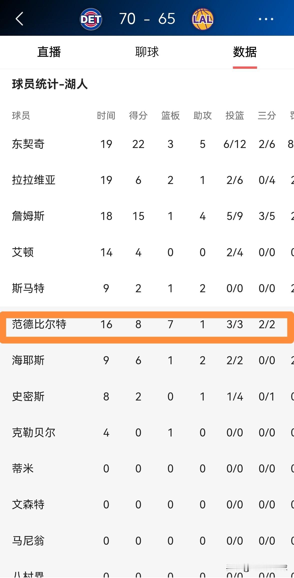 湖人悍将范德比尔特真是太惊艳了!在今天湖人主场迎战活塞的上半场比赛中,范德比尔特替补出战16分钟,投篮3中3,其中三分球2中2极其高效的砍下8分,还有7篮板1助攻。 今天的范德比尔特真是太让人惊喜,他在攻防两端都打出了无可挑剔的表现,试问这样的范德比尔特谁不喜欢?