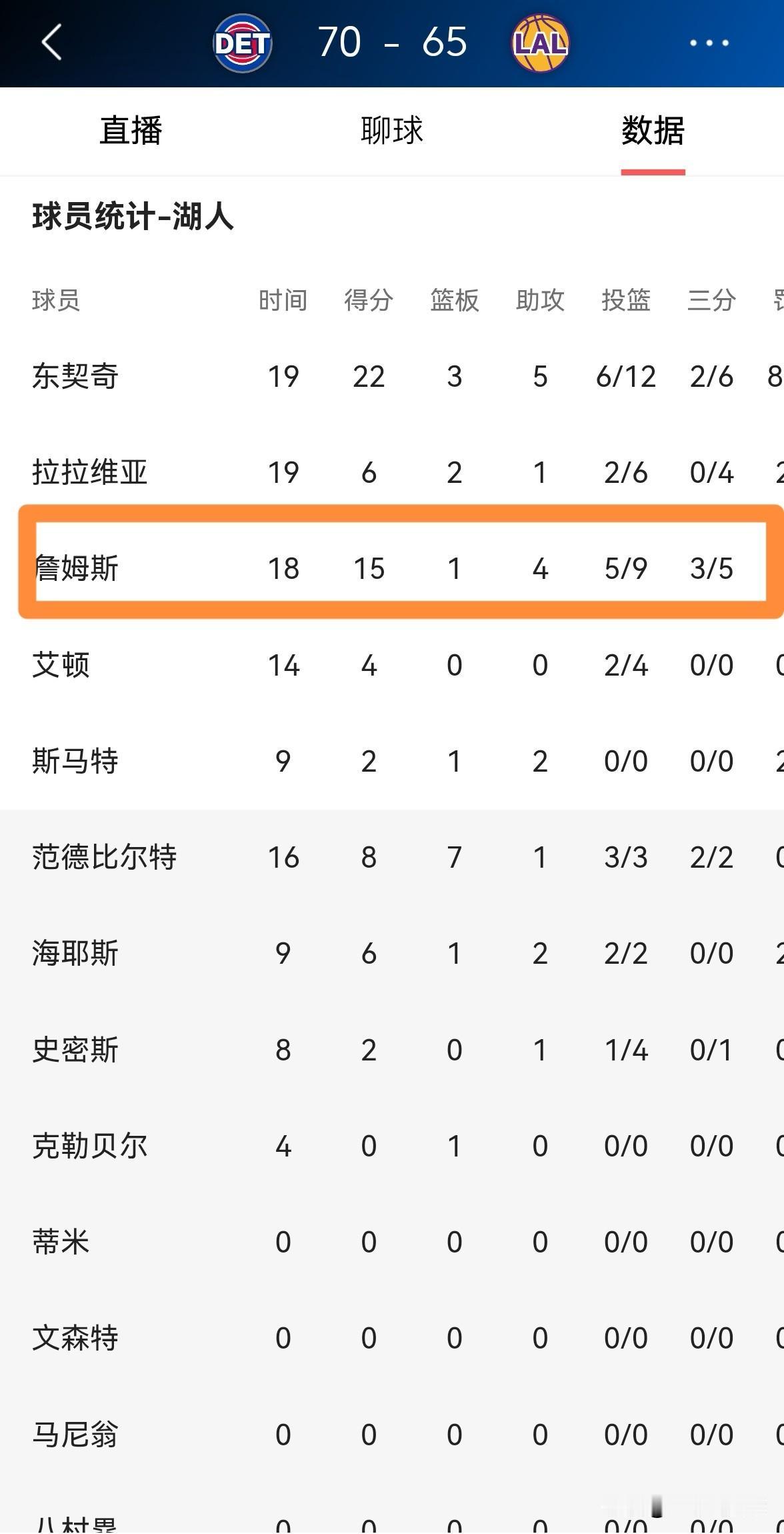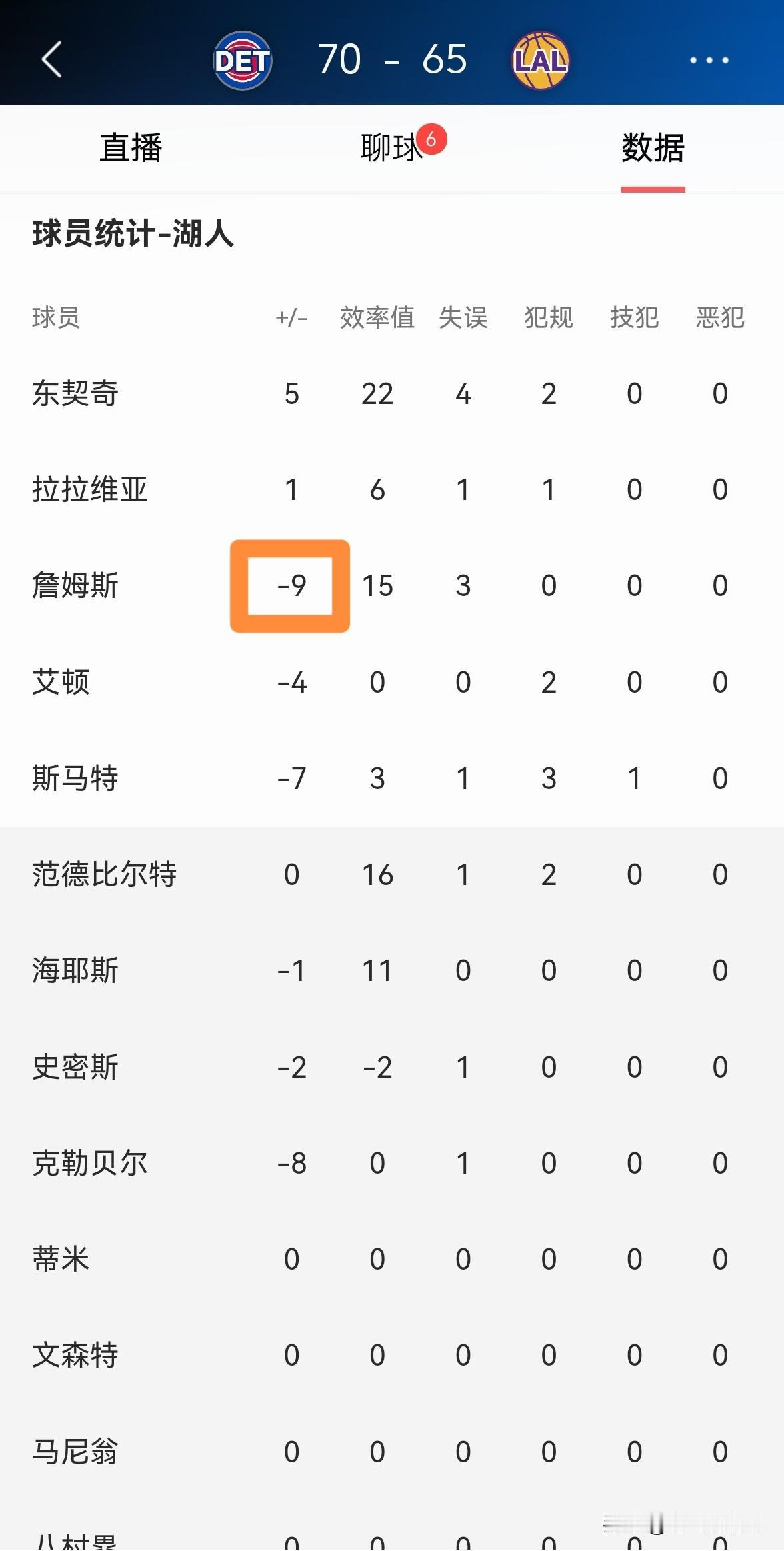 谁能拯救一下湖人巨星詹姆斯的场上正负值?在今天湖人主场迎战活塞的比赛中,目前双方半场战罢,湖人以65:70落后于对手。在前两节比赛中,41岁的詹姆斯首发出战18分钟,投篮9中5,其中三分球5中3、罚球5中2得到15分1篮板4助攻1盖帽,还有3次失误,不过他的场上正负值为全队最低的-9。 值得一提的是,在上半场比赛中,詹姆斯没有犯规,这说明詹姆斯的防守好还是他不防守?