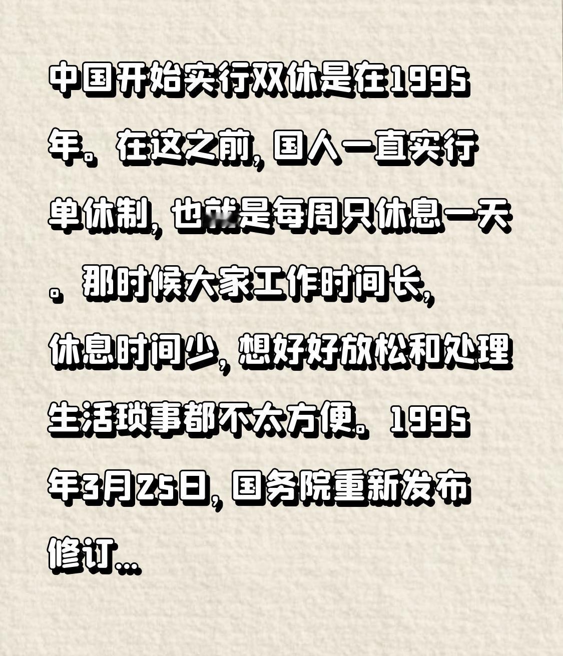 中国开始实行双休是在1995年。在这之前,国人一直实行单休制,也就是每周只休息一天。那时候大家工作时间长,休息时间少,想好好放松和处理生活琐事都不太方便。 1995年3月25日,国务院重新发布修订后的《国务院关于职工工作时间的规定》,规定自1995年5月1日起实行双休日,即“国家机关、事业单位实行统一的工作时间,星期六和星期日为周休息日。”双休的实行,让大家有了更多时间陪伴家人、提升自我,也带动了旅游、休闲等行业的发展,生活变得更加丰富多彩。 双休工作 双休制度 双休规定 双休