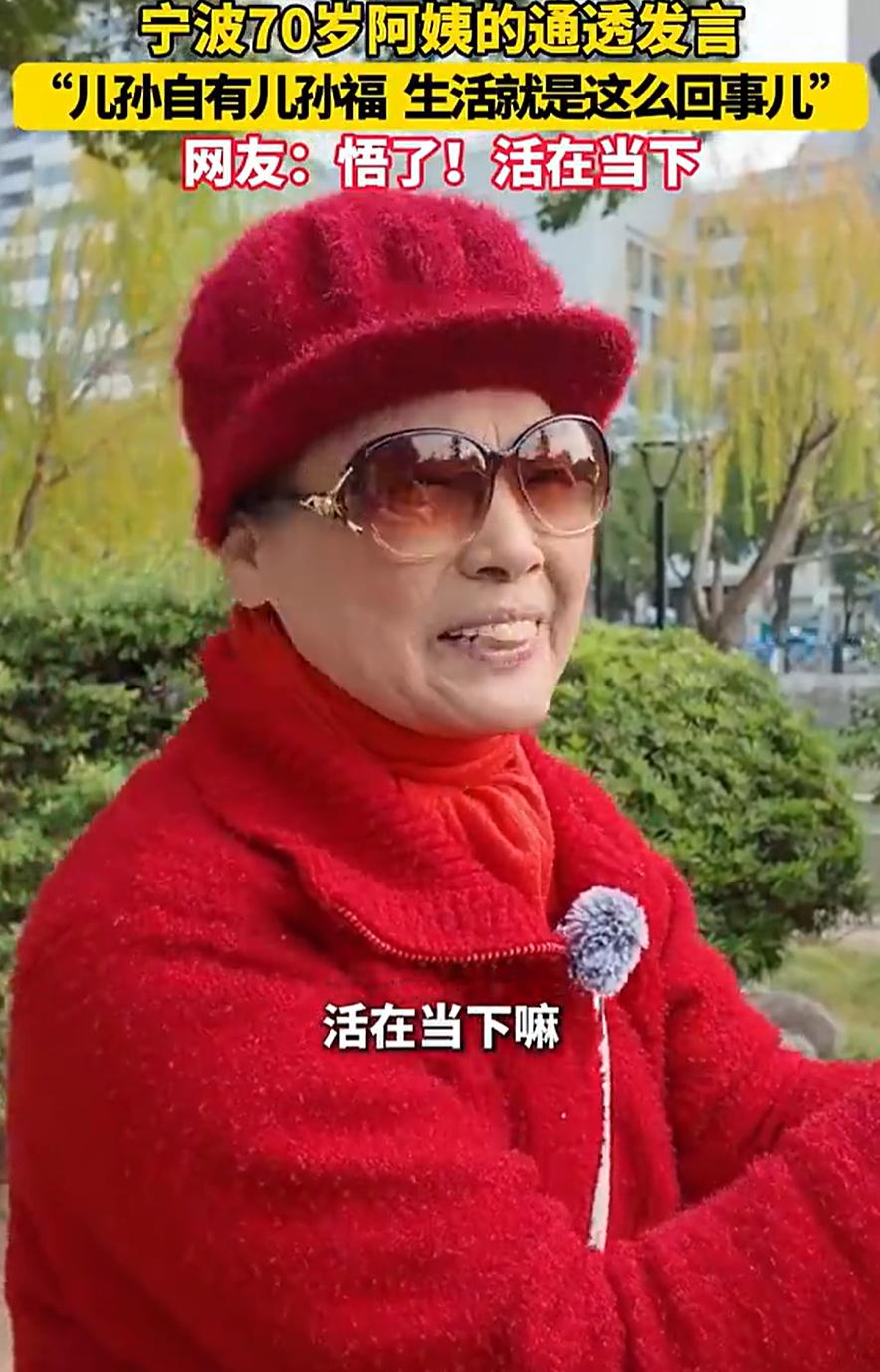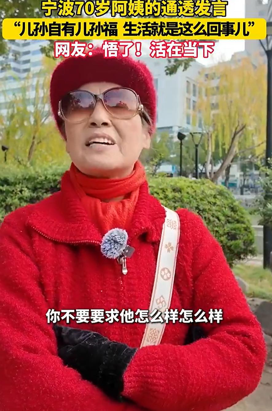 活的太通透了!浙江宁波,一位70岁阿姨说自己儿子现在三十七岁还没有对象呢,有人问她着不着急,她却说:儿孙自有儿孙福,不应该给孩子压力,网友:阿姨的现在就是我想要的未来 视频中,一位身穿红色大衣、戴着墨镜的阿姨正与人聊天。她看起来精神饱满,打扮得体,言谈间带着笑意。当被问起年龄,她说自己已经70岁了,周围人都有些惊讶——因为她看起来实在不像这个年纪的人 阿姨说,她没有装假牙,眼睛也不老花,每天见人都笑着打招呼。聊到家庭时,她提到自己有个37岁的儿子,至今还没找到对象 要是换作别的家长,可能早就急得团团转,到处托人介绍,天天催婚了。但这位阿姨却心态平和,她说,儿孙自有儿孙福,做父母的不应该给孩子太大压力。有机会遇到合适的人当然好,如果暂时没缘分,也不要硬撑。一家人健健康康地生活在一起,不也是挺好的日子吗? 她认为,人还是应该活在当下,过好眼前的生活 其实想一下,这个态度确实有值得称赞的地方,很多父母把子女的婚姻当作自己的责任和任务,觉得孩子不成家就是自己的人生缺憾。这种想法往往导致两代人关系紧张,催婚成为家庭矛盾的导火索。子女感到压力巨大,父母也觉得委屈,明明是“为你好”,怎么就不被理解呢? 我挺认同这位阿姨的想法。真正的为孩子好,不是替他规划一条看起来正确的路,而是给他一个不被催促的环境。人生不是赶场子,很多事慢一点,反而走得更稳。能吃好饭,睡好觉,心里不慌,身边有人愿意陪着,这样的生活本身就值得被珍惜