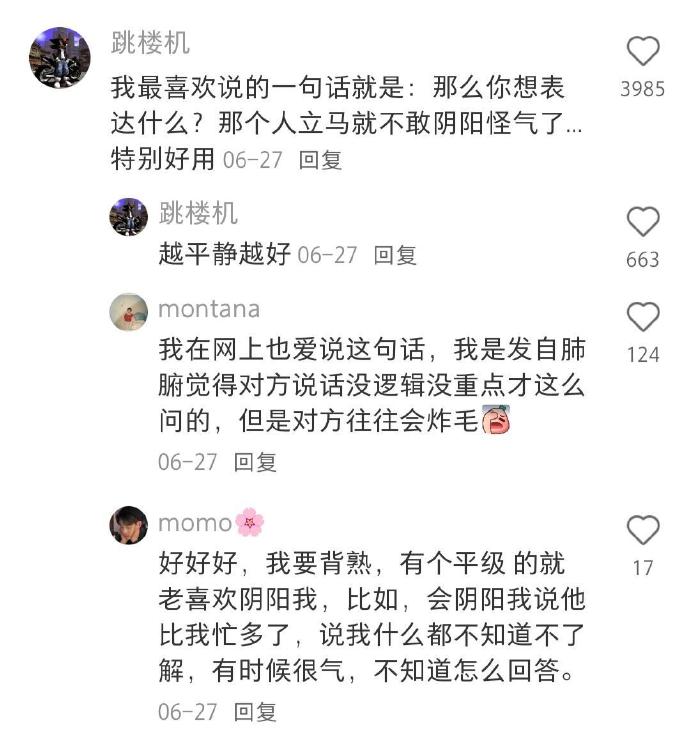 我最喜欢说的一句话就是:那么你想表达什么?那个人立马就不敢阴阳怪气了...特别好用