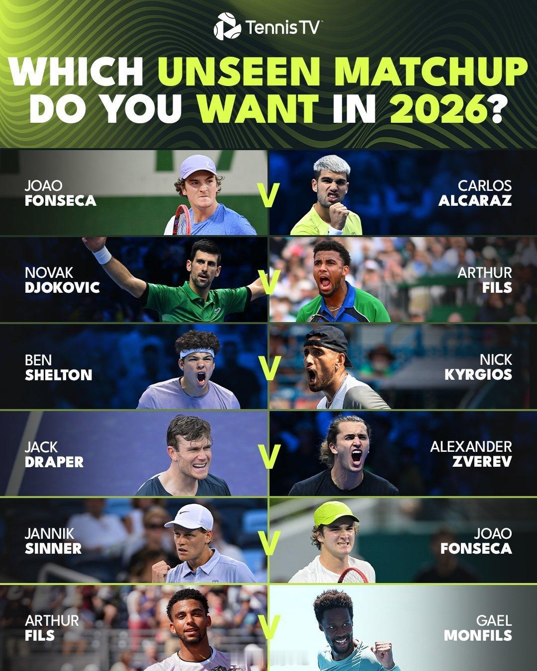 2026赛季你最想看哪两位球员交手?1️⃣阿尔卡拉斯vs丰塞卡2️⃣德约科维奇vs菲斯3️⃣谢尔顿vs克耶高斯4️⃣德雷珀vs兹维列夫5️⃣辛纳vs丰塞卡6️⃣菲斯vs孟菲尔斯年度体育榜样力量体育大赏