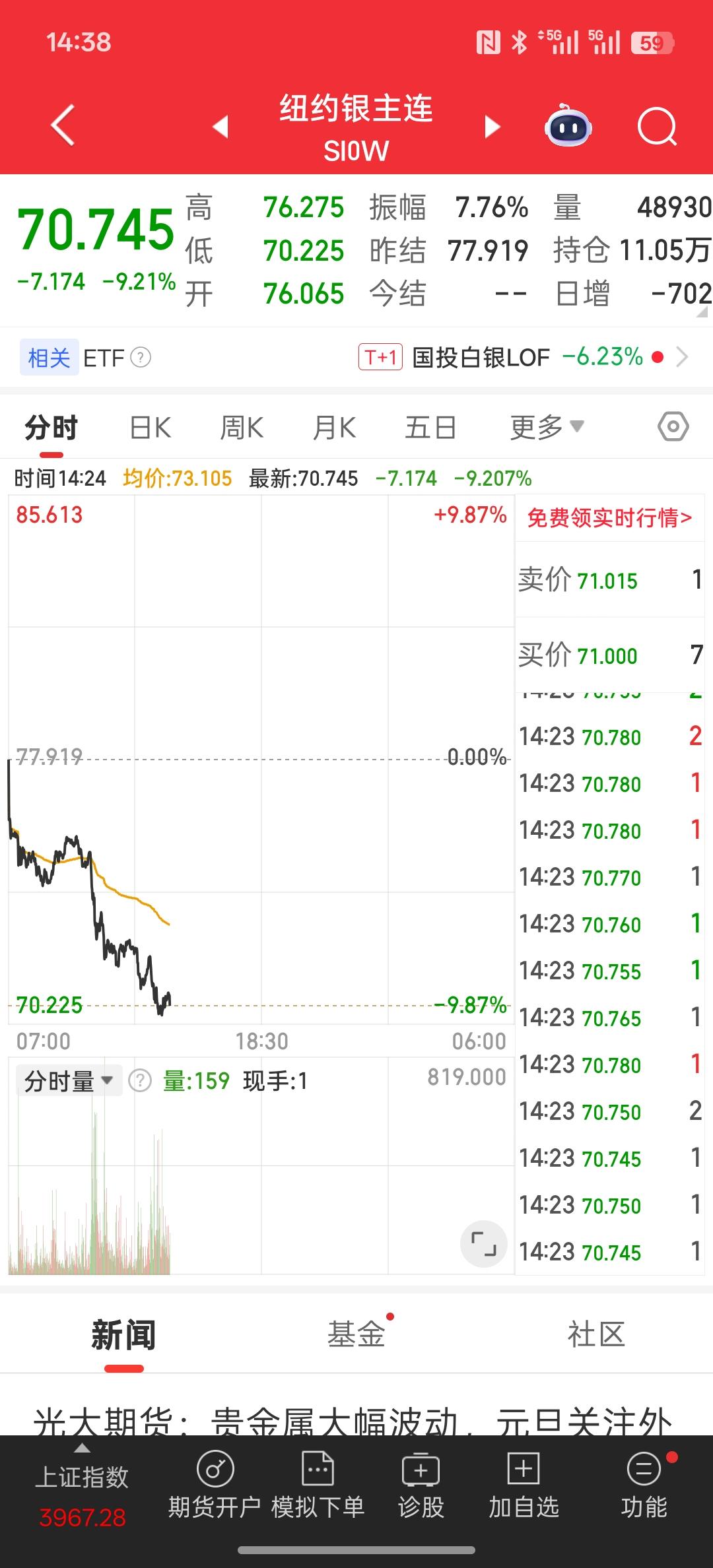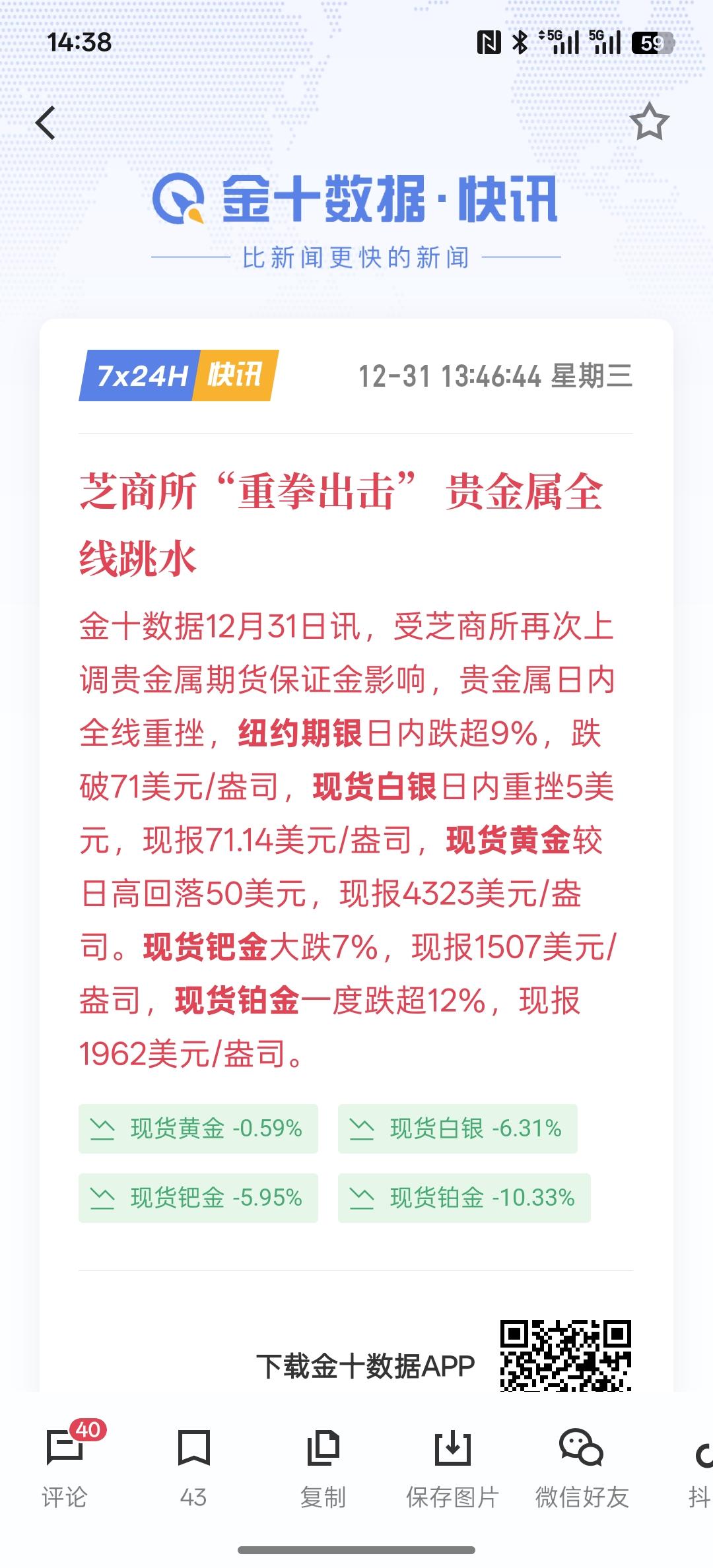 白银黄金大幅跳水,一周内第二次 芝商所再次上调贵金属期货保证金,继续提高保证金,就是为了防止大幅下跌造成杠杆资金爆仓,风险在提前就已经提示,但有些人依然脑袋过热,去追高黄金白银!后续可能还要大跌,估计最高的又站在了高岗上面!这一次的大幅下跌,估计有人开始爆仓了!