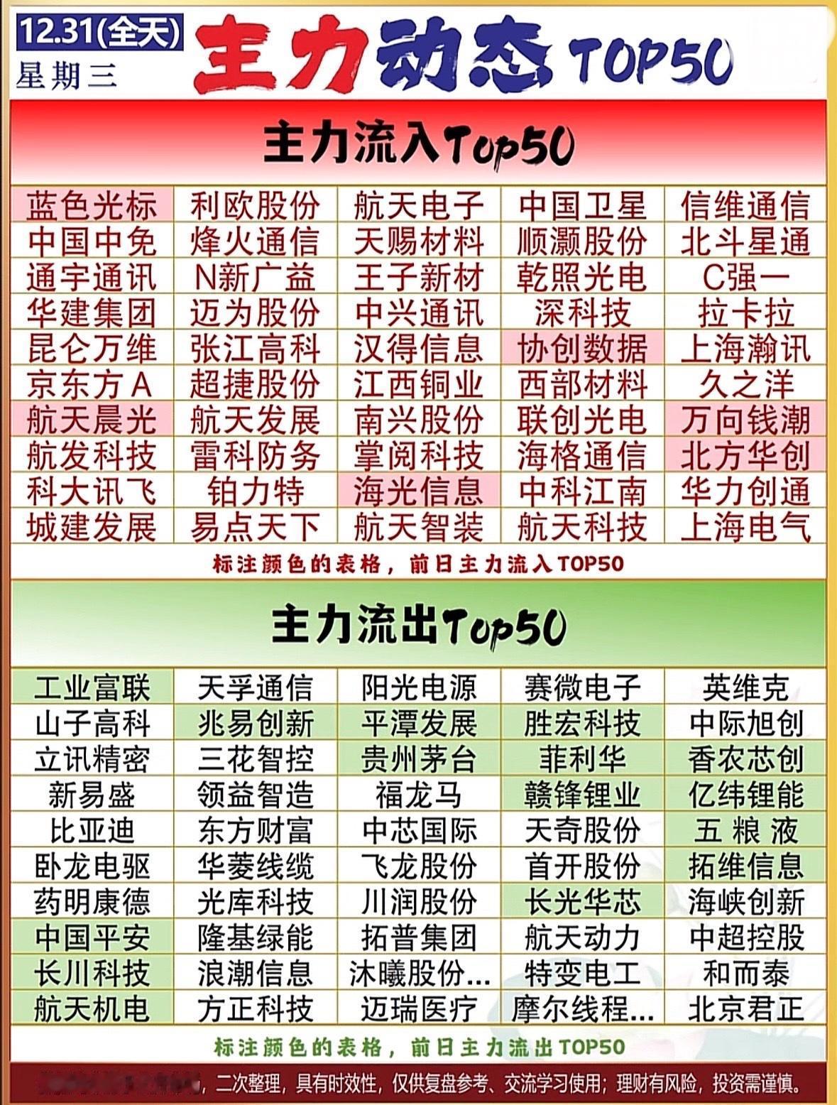 12月31日收盘主力动向TOP50 揭秘主力资金流向,助你投资决策!📈💰 主力资金青睐科技与航天股, 蓝筹消费遭抛售。市场分化明显, 投资需理性。