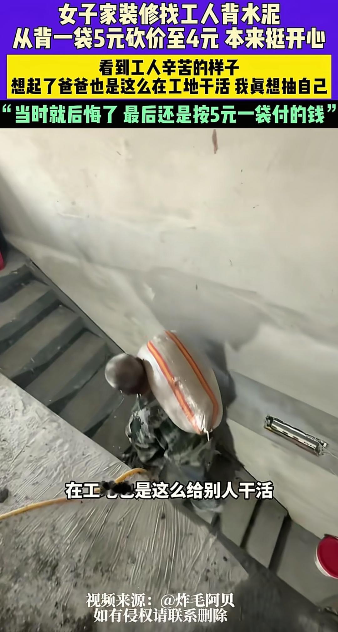几块钱的砍价是交易常态, 可把白发老人的汗水当议价筹码,就成了对劳动的轻慢。河南这位女士的补钱举动,之所以让人破防, 正是因为她守住了最珍贵的共情底线。 砍价本身无关对错,但得有边界 不能让底层劳动者的艰辛, 为我们的“省钱欲”买单。 五十公斤的水泥压在老人肩上, 爬五楼的每一步都藏着生活的重量, 这哪是几块钱能衡量的? 她递出的不是额外的施舍, 而是对劳动价值的正视。 比起省下来的三十块, 内心的踏实与善良才是最值钱的财富。真正的文明从不是衣着光鲜的体面, 而是懂得对每一份汗水报以尊重。 生活里的小计较很常见, 但你有没有过为了几块钱, 事后却满心愧疚的时刻? 来评论区聊聊~