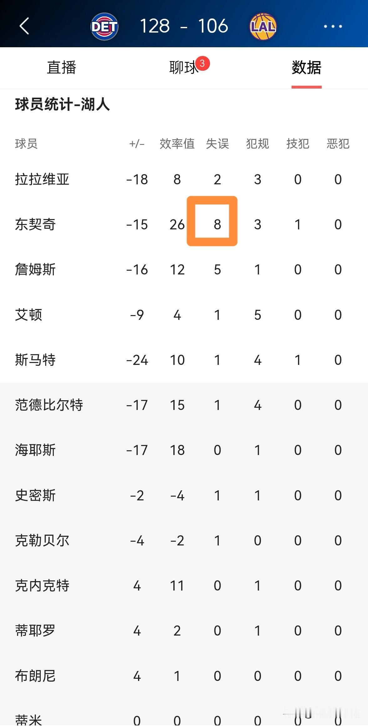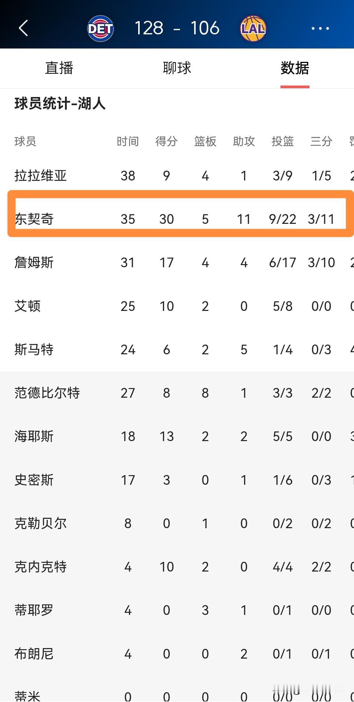 我一定要怒喷湖人当家球星东契奇,他真是球队的大累赘!在今天湖人主场以106:128惨败于活塞的比赛中,东契奇不仅浪投,而且疯狂的出现了8次失误,他绝对是球队输球的罪魁祸首。 全场比赛下来,东契奇首发出战35分钟,投篮22中9,其中三分球11中3、罚球13中9得到30分,出现了8次失误。 坦白说,我从来没有见过像东契奇这样糟糕的球队核心,他在攻防两端都是球队的累赘。