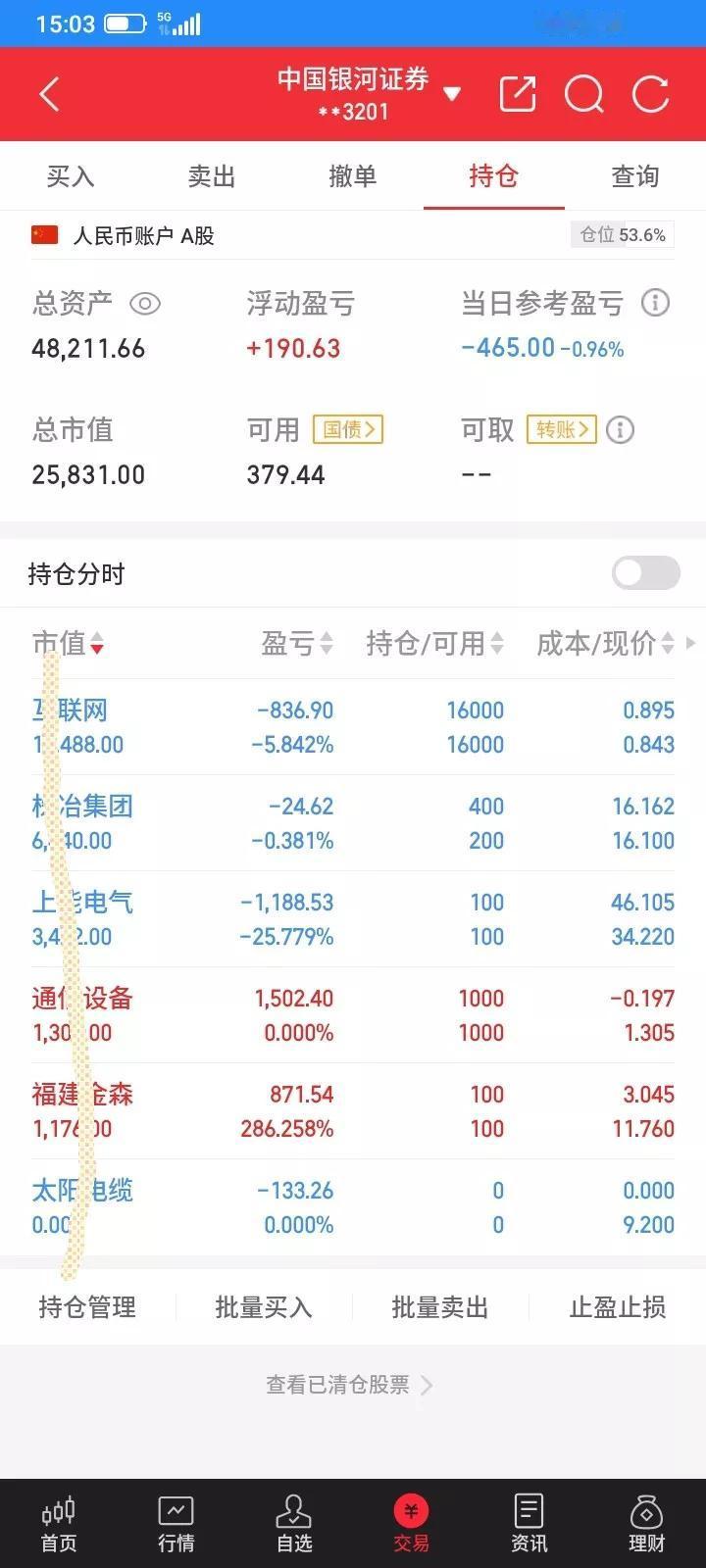2025.12.31,今年终于完了,上证指数依然强势,但是我持有的几只股票全部大跌,etf也是下跌。又是亏损的一天。 昨天买入的太阳,今天低开低走,早上大幅下跌,触发了止损条件单,以9.05清仓卖掉200股,亏了百分之五点多,卖掉之后下跌了一点点,又触底反弹了,又是卖错了,恐慌过度。 株冶低开高走,很快冲高到16.55元,想赚更多,舍不得卖,又是冲高回落,回落中以16.12又买入200股,又买错了,买入之后就下跌。 互联网etf昨天上涨舍不得卖,今天又下跌了,再创新低,收盘以0.843卖掉4000股,上涨不卖,下跌卖,亏损更多了。 其它的也是继续下跌,都继续持股待涨吧。 今天总市值2.58万元,总资产4.82万元。今天总体账户亏损465元。今年做得太失败了,大牛市反而还是亏损,今年亏了5100多块钱。明年调整策略,使用新的交易系统。希望明年好运吧。