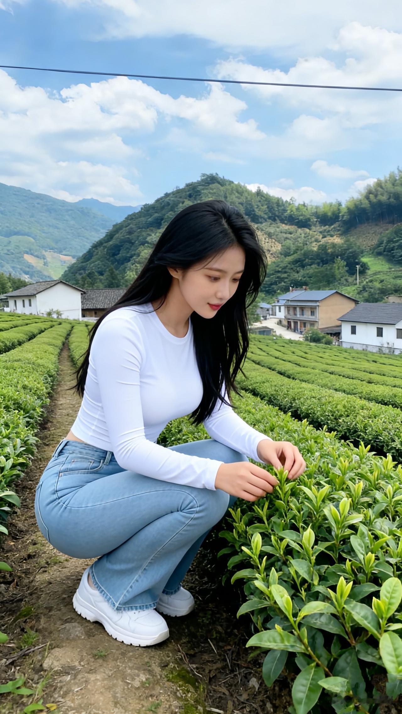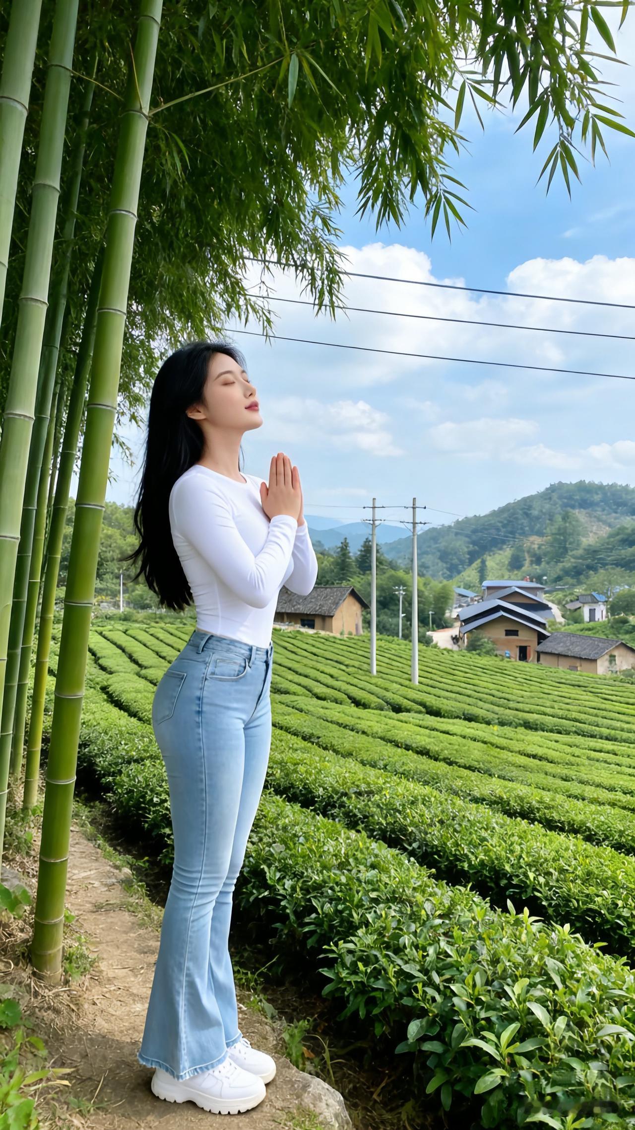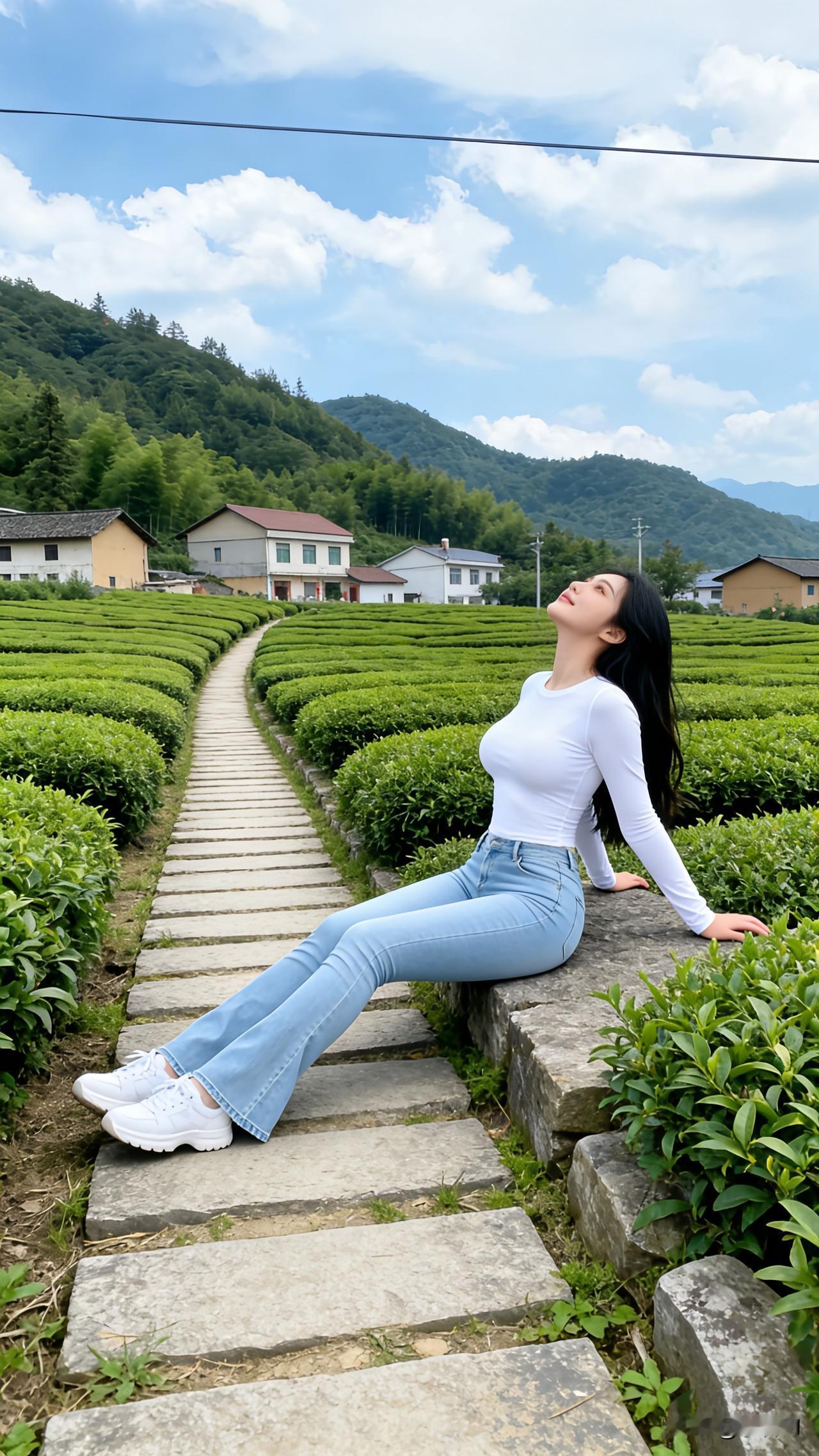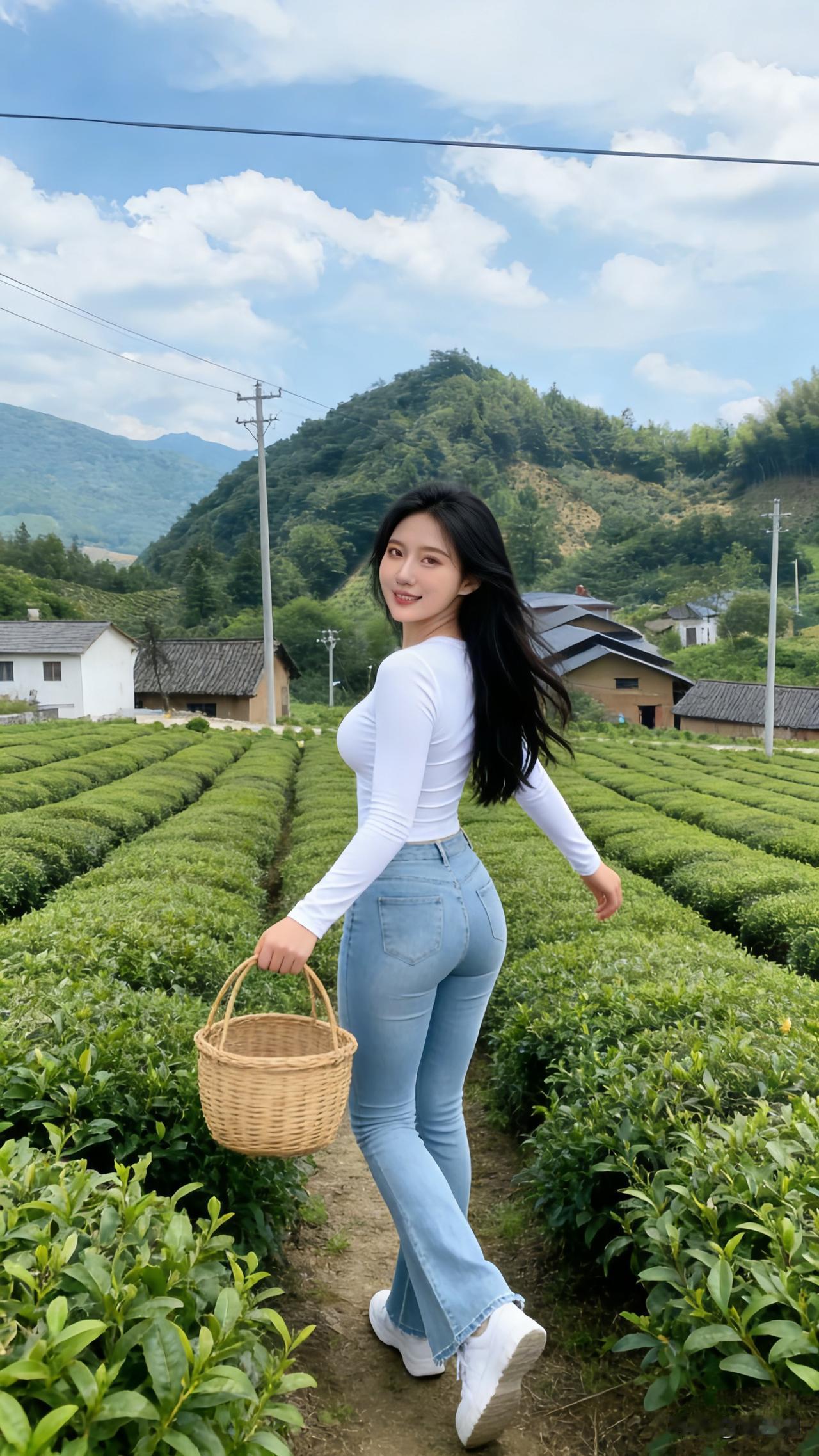 《乡径佳人》 翠岭连绵入远天,乡蹊坦坦绕村前。 云鬟轻挽簪丝雪,素颈微扬衬玉