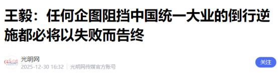 王毅外长发出统一最强音,向全世界通报两件事,中国再也不避讳了! 解放军“正义使命-2025”演习第二天,王毅外长发出了统一最强音:一个是他强调完成祖国统一是必须完成的使命;另一个是中方要坚决反对并有力反制美方“对台军售”,直接点了美国的名! 王毅外长明确强调,完成祖国统一是中华民族必须完成的使命,这一使命不容拖延、不容干涉,更不容任何分裂势力从中阻挠。台湾自古以来就是中国领土不可分割的一部分,这从历史到法理上都是没法反驳的事实。 现在世界上已经有183个国家,在一个中国原则基础上和中国建立了外交关系,它们都承认中华人民共和国政府是代表全中国的唯一合法政府。这一国际社会的广泛共识,早就成为了国际关系的基本准则。 但最近几年,岛内赖清德当局在“台独”分裂的道路上越走越远。今年3月,他们公然把大陆定义成“境外敌对势力”,还炮制了17条所谓的“国安措施”。 到了12月,又通过所谓“两岸人民关系条例”修正草案,把基层公务员都纳入“流刺网”式的管控,全面限制公务人员赴陆,让两岸同胞正常的探亲旅游都成了奢望。 更让人愤慨的是,赖清德当局一门心思“跪美媚日”,还附和“台湾有事日本有事”这种荒谬的论调,甚至扭曲抗战历史,把台积电的核心产能往美国转移,还大言不惭说要把防务预算提升到GDP的5%,完全不管台湾的经济发展和民众的切身利益。 可分裂行径终究不得人心,超过800万台湾民众联署弹劾赖清德,两次罢免投票都让民进党当局惨败。 这些都证明“台独”逆流根本挡不住统一的洪流,王毅外长的表态正是顺应了历史大势和民心所向,明确告诉世界:祖国统一不是选择题,而是必须答对的必答题。中方实现完全统一的决心坚如磐石,任何人都别抱有不切实际的幻想。 王毅外长还重点通报了一件事,那就是中方会坚决反对美方的“对台军售”,还会采取有力措施反制,这一次中方直接点了美国的名,没给任何模糊的空间。 就在演习前夕的12月26日,美国宣布向中国台湾地区出售总价值超过111亿美元的武器。这一笔的金额就超过了拜登政府4年对台军售的总和,还创下了历史新高。 这次军售的武器种类特别有进攻性,还形成了体系化,包括82套“海马斯”火箭炮系统、60门M109A7自行榴弹炮,还有反装甲无人机、反坦克导弹以及“台湾战术网络暨部队觉知应用套件”。 美方就是想通过这些装备,让台湾变成“刺猬岛”,帮助台军融入美军的作战网络,本质上就是在台海拱火浇油,故意破坏地区的和平稳定。 更严重的是,美方的做法彻底违背了中美三个联合公报,特别是“八・一七公报”的规定。公报里明确写着,美国不寻求长期向台湾出售武器,准备逐步减少并最终解决这一问题,可现在美方的军售行径明显是背信弃义、公然挑衅。 对此,中方早就采取了有力反制,外交部在12月26日宣布,对诺斯罗普・格鲁曼、波音圣路易斯分公司等20家美国军工相关企业,还有10名企业高级管理人员实施制裁。 冻结他们在华的动产和不动产,禁止中国境内的组织和个人跟他们进行交易合作,还不给他们签发签证,不准他们入境。王毅外长的表态再次强调,美方的对台军售就是在给“台独”分裂势力递“投名状”,最终只会把台湾推向危险的边缘,中方绝对不会坐视不管。 任何参与对台售武的企业和个人,都要为自己的错误付出代价,美方必须停止这种危险的行径,不然中美关系会面临更严重的后果。 解放军“正义使命-2025”演习展示的是维护国家统一的硬实力,王毅外长的最强音传递的是中方不容干涉的坚定意志,这一武一文、双管齐下,正好说明在台湾问题上,中方已经进入了主动作为、不再回避的新阶段。 专家早就指出,美方对台军售根本不是为了“保护台湾”,而是为了军火牟利和战略操弄,最终只会掏空台湾,让台湾民众承担所有代价。而“台独”分裂势力妄图依靠外部势力谋独、以武力抗拒统一,简直就是蚍蜉撼树,根本不可能得逞。 现在,大陆经济蓬勃发展,国防实力突飞猛进,福建两岸融合发展示范区一直在深化建设,两岸同胞在救灾等场景中也一直守望相助,这些都为统一大业奠定了坚实的基础。 王毅外长的通报既是对“台独”分裂势力和外部干涉者的严正警告,也是向世界重申:台湾问题是中国的内政,任何外部势力都无权干涉。中方捍卫国家主权和领土完整的决心、意志和能力,都不容低估。