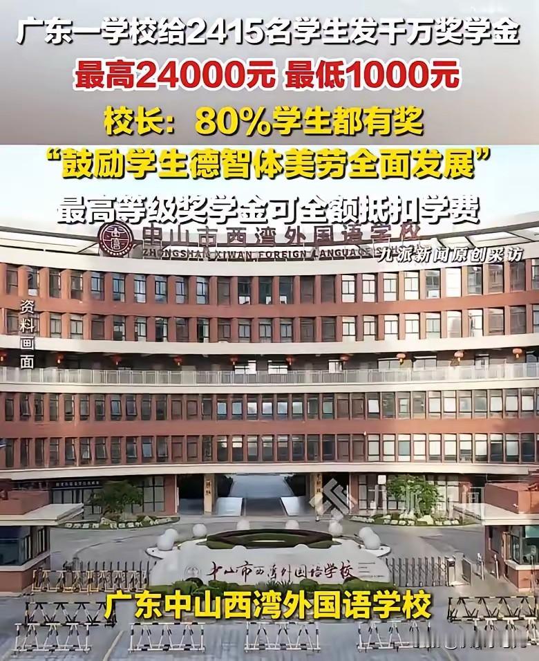 广东中山一民办学校给2415名学生发放千万奖学金,奖金高达24000元,能覆盖全额学费。田校长说基本上80%的学生都能获取奖学金,鼓励学生在德智体美劳全面发展。 这消息一出来,家长在说这学校太给力了。要知道民办学校学费可不便宜,一年几万块是家常便饭,24000块的全额奖学金,等于直接给娃免了一年学费,这谁听了不心动?2415个孩子拿到奖励,80%的覆盖率,这意味着大部分孩子只要肯下功夫,都能捞着好处。不像有些学校,奖学金就盯着那几个尖子生,普通人想都别想。 田校长提的德智体美劳全面发展,可算说到家长心坎里了。现在早就不是单看分数的年代了,娃身体棒、品行好、爱动手,比啥都强。这学校把这些都算进奖学金考核里,逼着孩子全面发展,可比天天刷题啃书本有意义多了。 有人说民办学校全靠学费撑着运转,一下子掏出上千万发奖学金,真就只是为了鼓励学生?明眼人都看得出来,这妥妥是招生大招。高额奖学金往那一摆,周边的好苗子不得抢着来?好生源扎堆了,学校口碑和升学率跟着涨,后续招生就能滚雪球,怎么算都不亏。 德智体美劳这几项,哪像考试分数那样有准头,全靠人评的话,会不会有猫腻?奖学金的考核标准到底透不透明。比如有的孩子成绩一般,家长跟学校关系好,就能蹭到奖学金?这种担心真不是多余的,毕竟是真金白银,公平才是硬道理。 说到底,不管学校打的什么算盘,这笔千万奖学金对学生和家长来说,都是实实在在的好处。要是能把考核标准明明白白晒出来,真真正正做到凭本事拿奖,那这波操作绝对能让家长们心服口服。 各位读者你们怎么看?欢迎在评论区讨论。