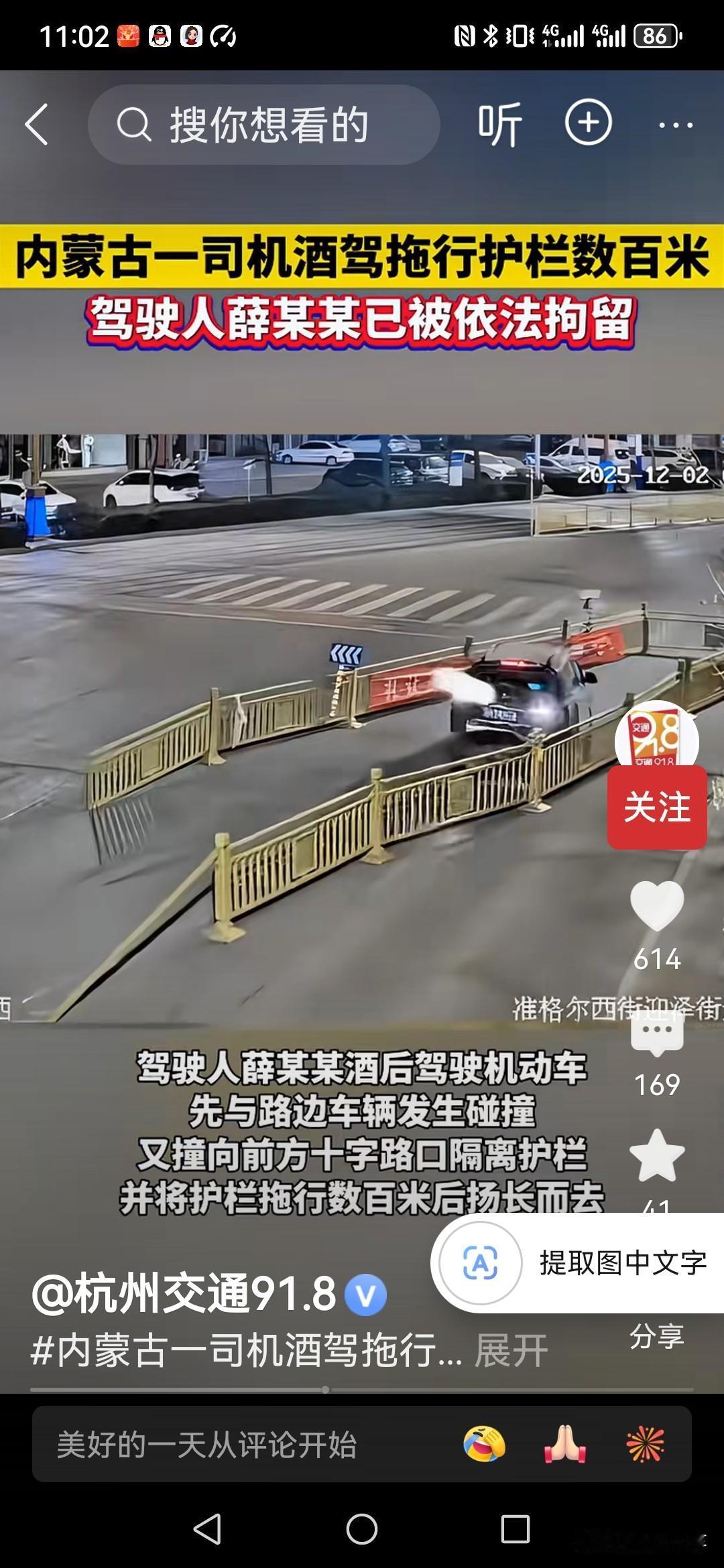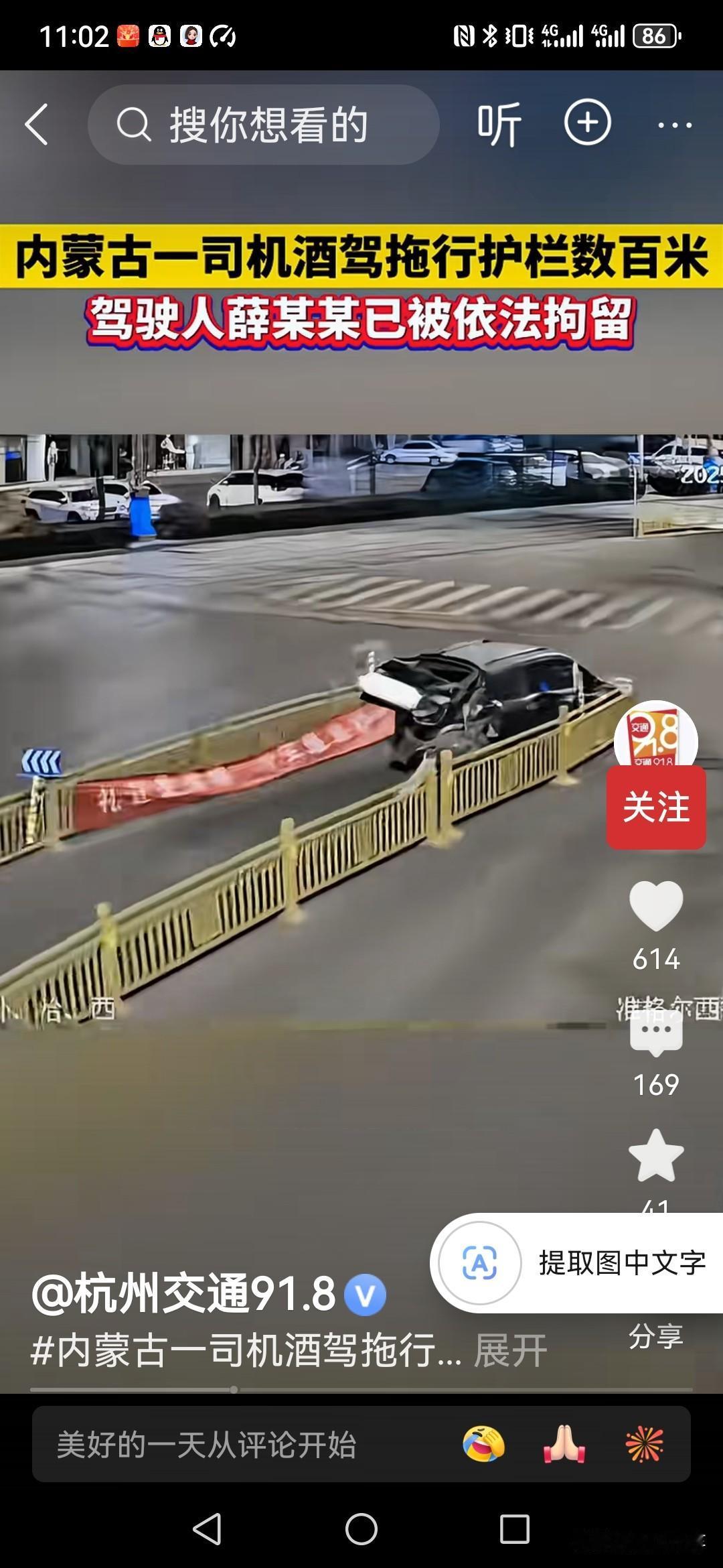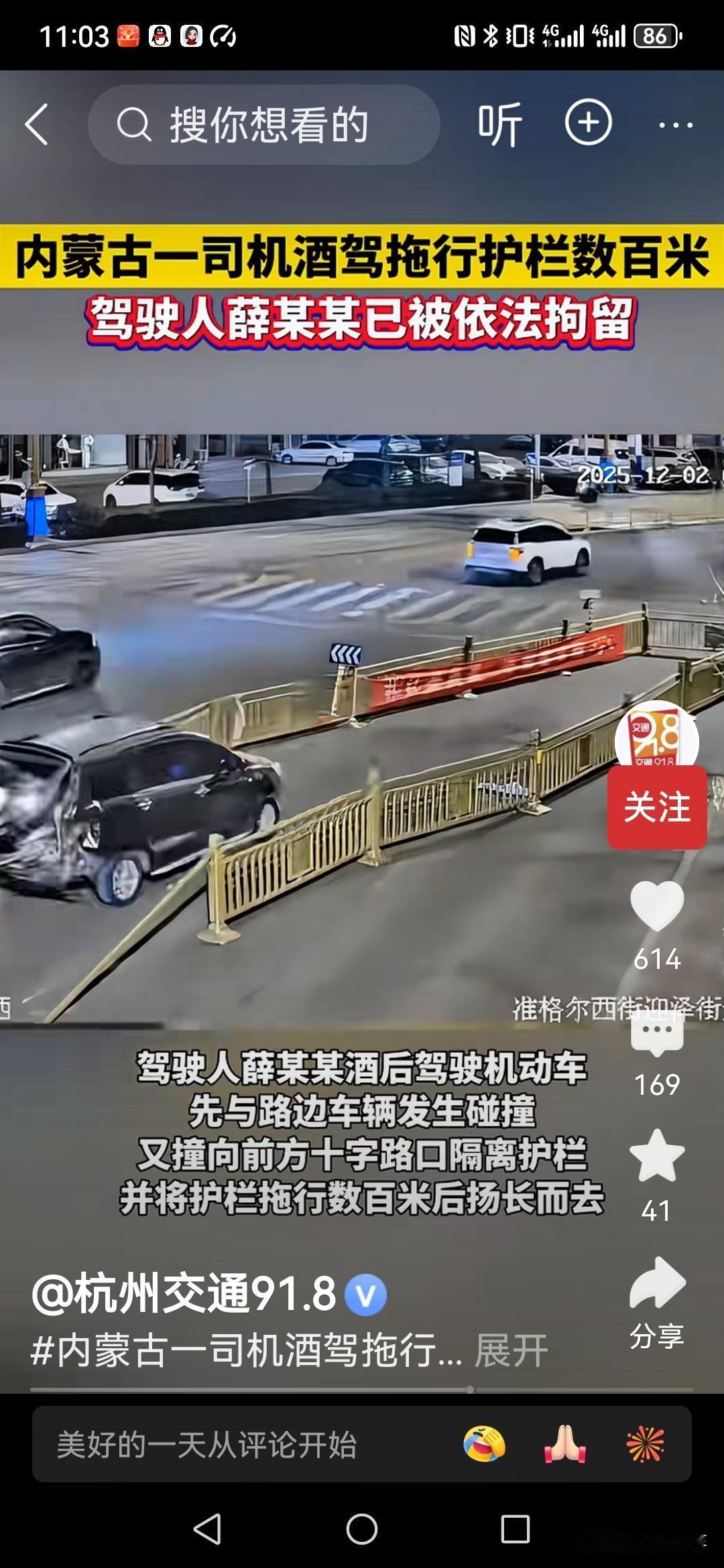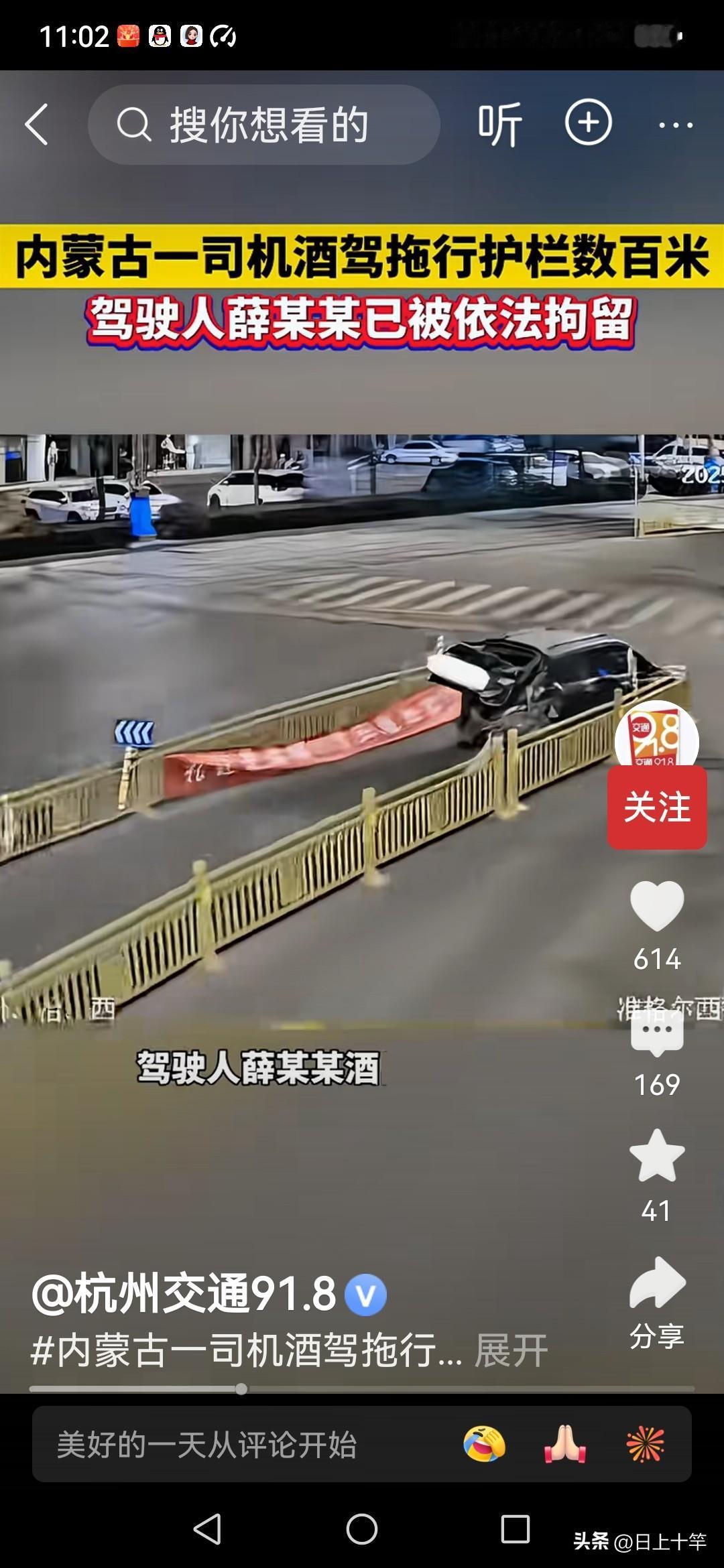 内蒙古鄂尔多斯这位酒驾“厉害”了,先在道路上和其他车辆碰撞后,又开车逃逸。 结果喝醉酒脑子不清醒,直接撞到隔离护栏上,还带着十几米长的护栏,在马路上狂奔了几百米! 最后发现走不了,才停下,从护栏中倒车出来! 这是喝了多少酒?司机已经被拘留,估计够喝好几壶了!
