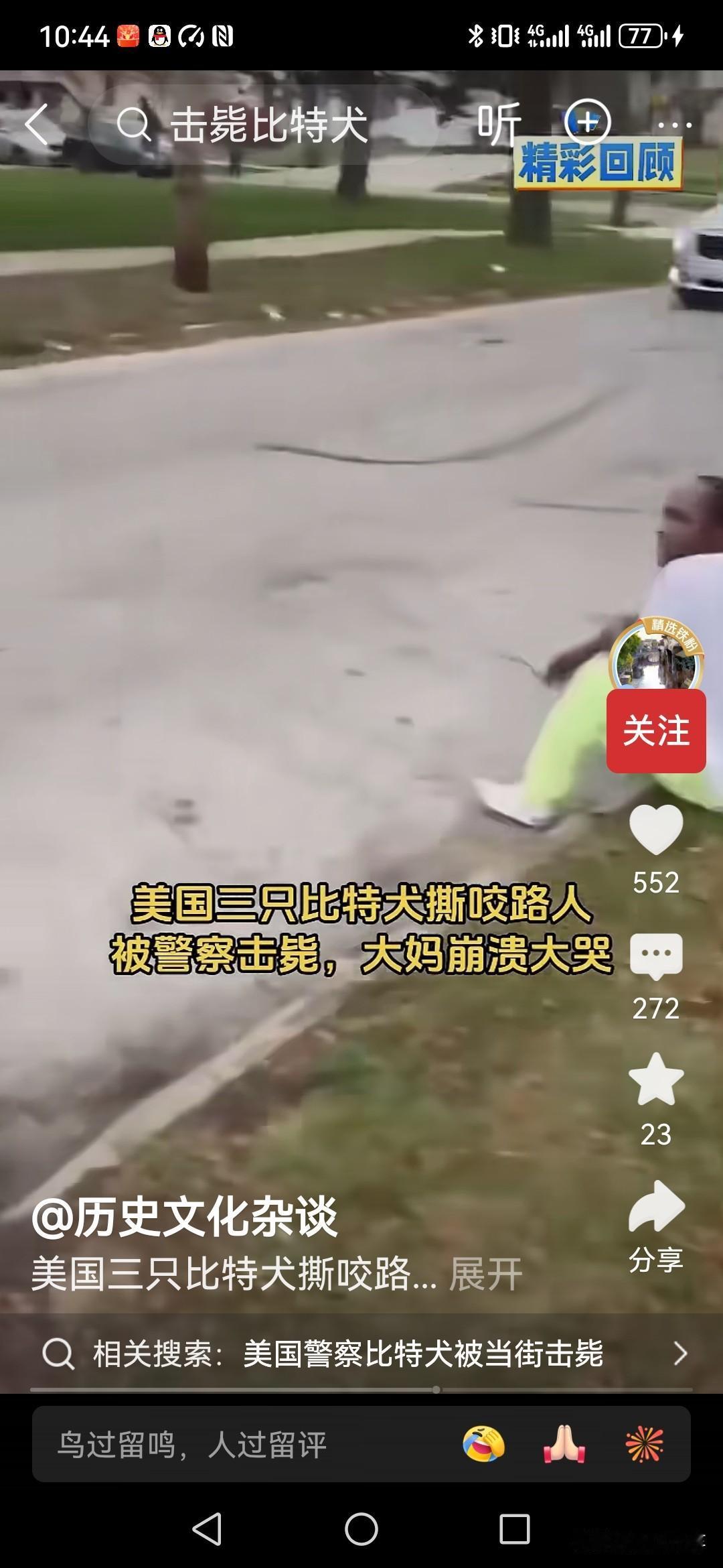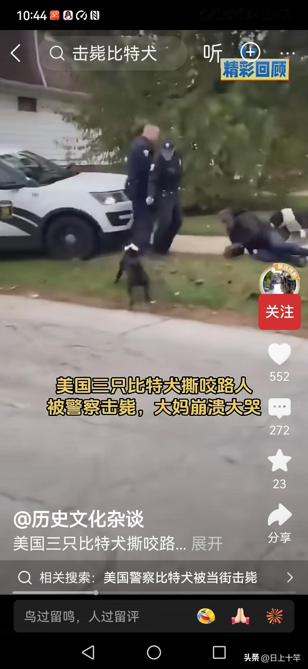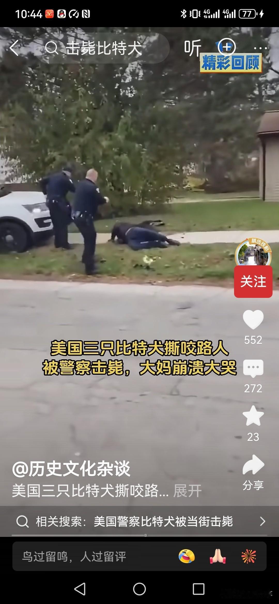 美国虽然有些严格的动物保护法,面对动物伤人事件,还是很干脆的,直接动枪!这是美国街头,三只比特犬撕咬路人,被警察当场击毙的画面! 很奇怪的是,美国是世界上饲养比特犬这类烈性犬最多的国家,据统计,在全美大概有450万只比特犬,而在美国近数十年历史中,比特犬咬死295人,伤害5507人,远超其他犬类。 美国人为什么这么喜欢养烈性犬,还是深受美国主流文化影视作品影响的,因为比特犬强健的肌肉和勇猛的形象,美国人觉得比特犬代表强大守护者和硬汉的符号,所以很多人饲养! 在中国是被很多城市都明令禁止饲养的!这也是典型的中美差异!
