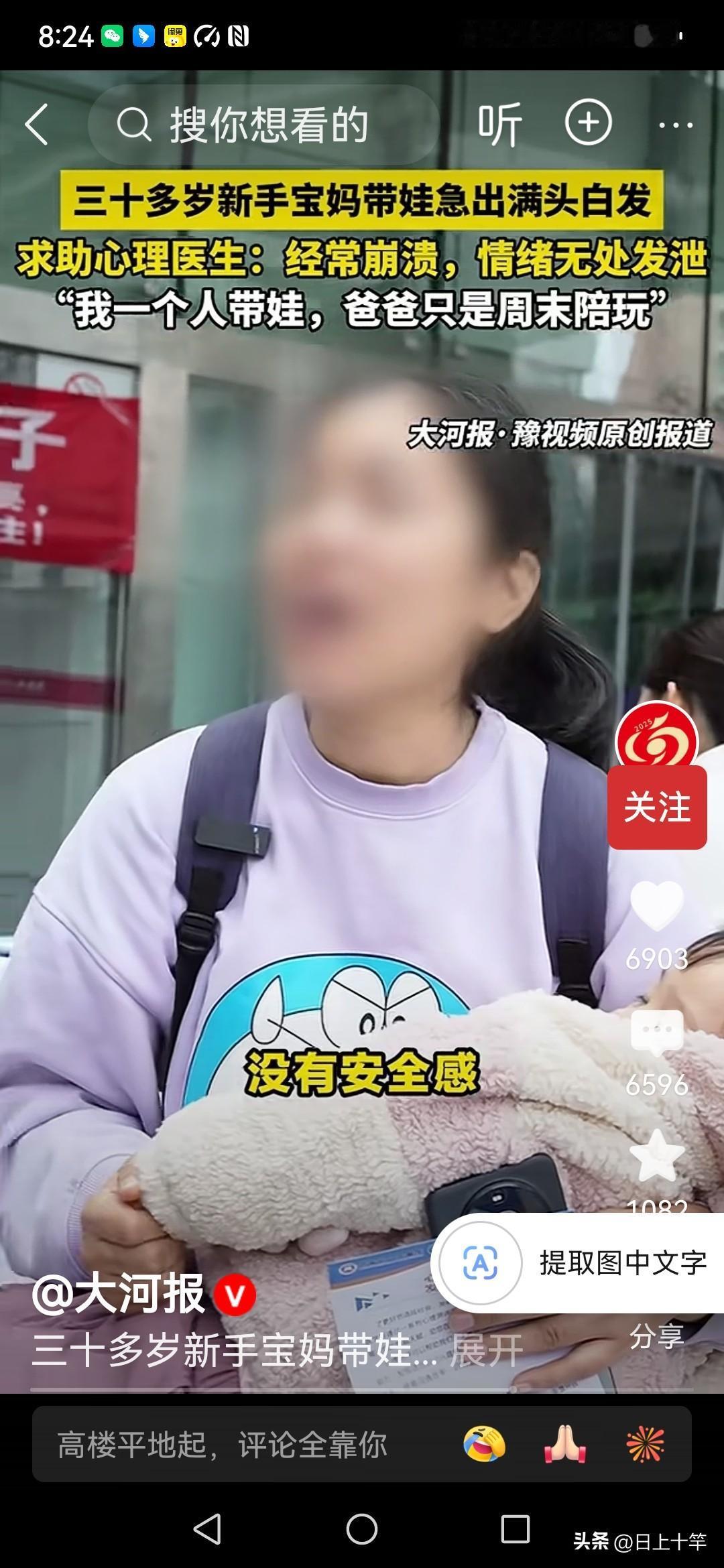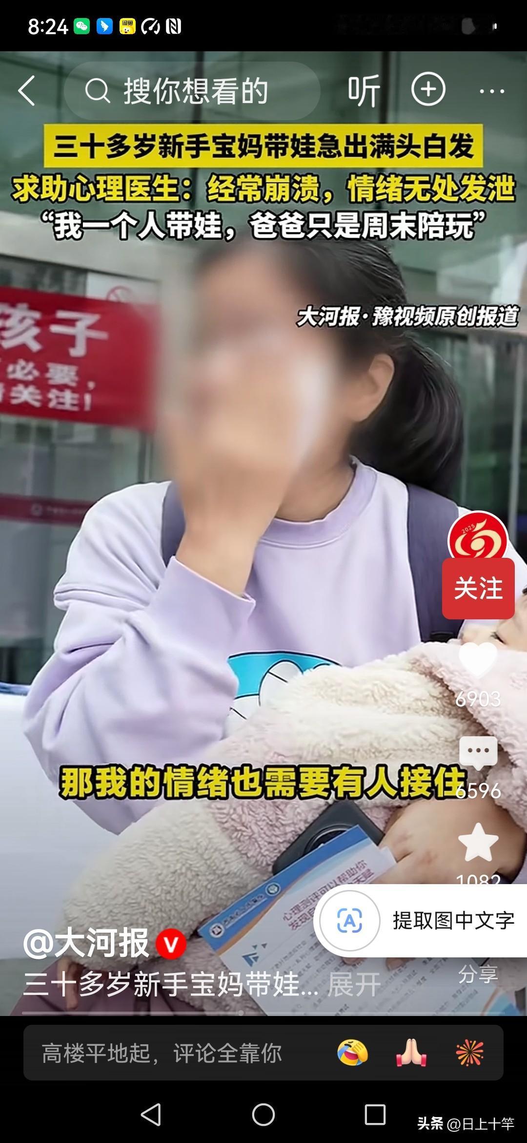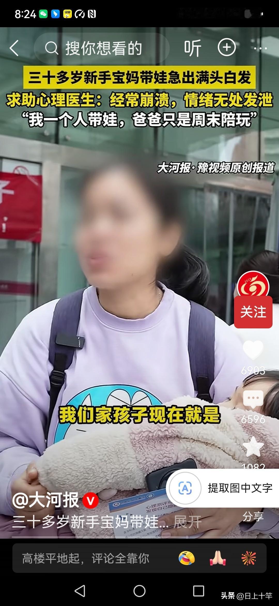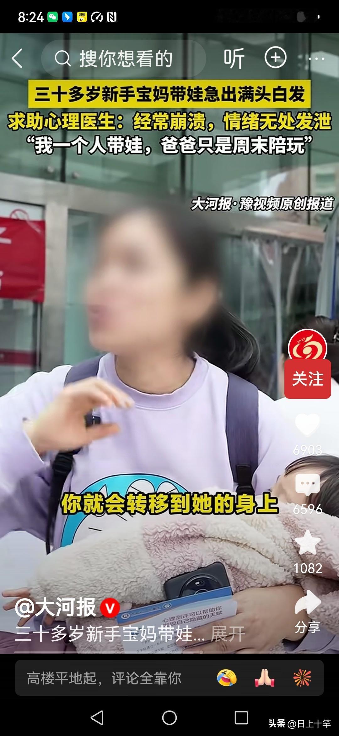 三十岁宝妈,孩子才两岁,已经满头华发丛生了!这是她来寻求心理咨询的现场,面对记者采访,不停地倒苦水。 从孩子出生,她就感觉没人理解她,在乎她;大家的中心和关注点都在孩子身上。 爸爸参与照顾孩子很少,即使周末在家也就是陪孩子玩一会,而孩子有事都是找妈妈,这让她更有压力,感觉没有了自我! 这位宝妈哭述,现在自己的情绪没人在乎,没人能听她倾诉,她也需要自己的情绪能被人接住,如果没人能接住,她就只能发泄在孩子身上,所以现在孩子也没有安全感! 从视频中看得出来,这位宝妈的确非常辛苦和憔悴,事实上很多刚生孩子的妈妈是很容易得产后抑郁的,这时候需要非常小心注意呵护好妈妈的情绪。 只有妈妈情绪好了,孩子才能得到最好的照顾,不要本末倒置,把重心放到孩子身上,其实妈妈才是最重要的那一个!