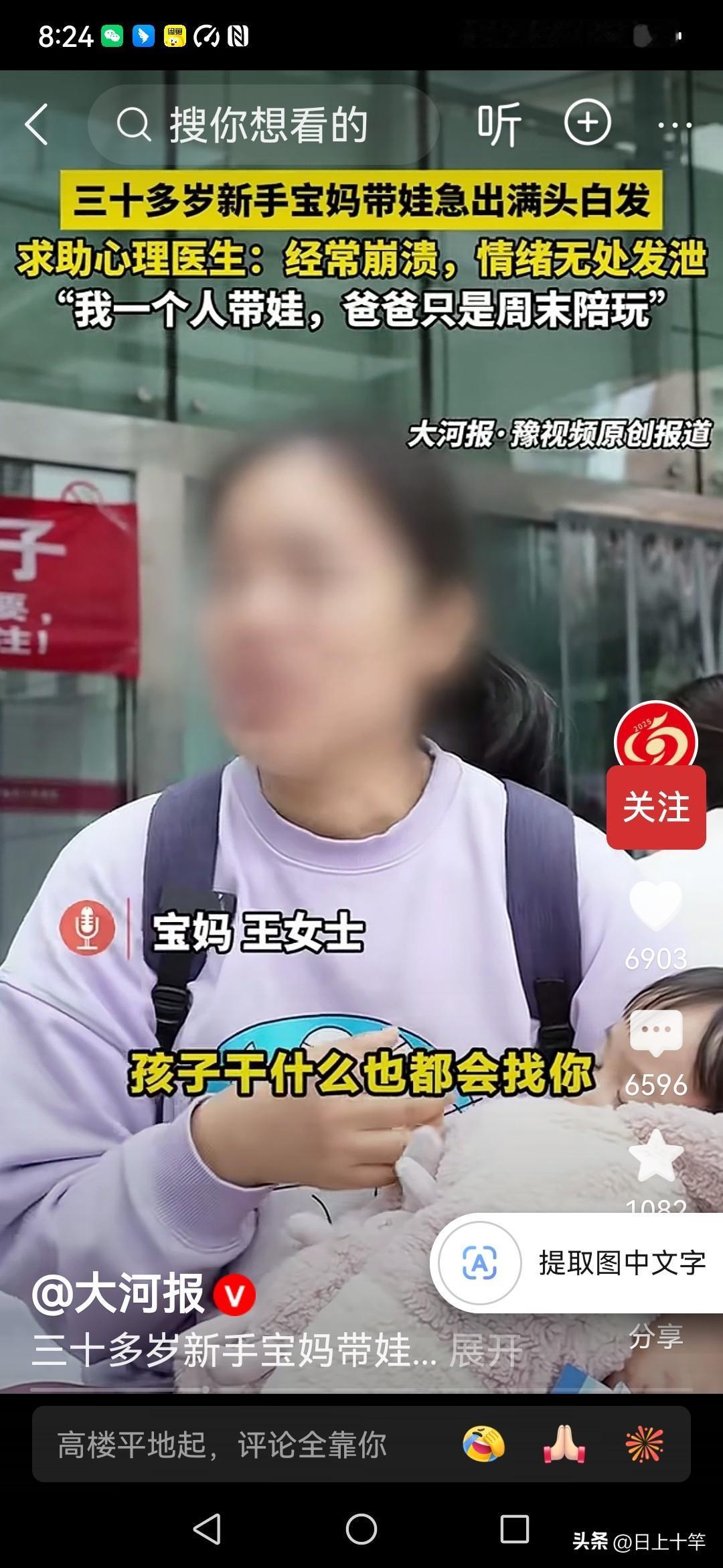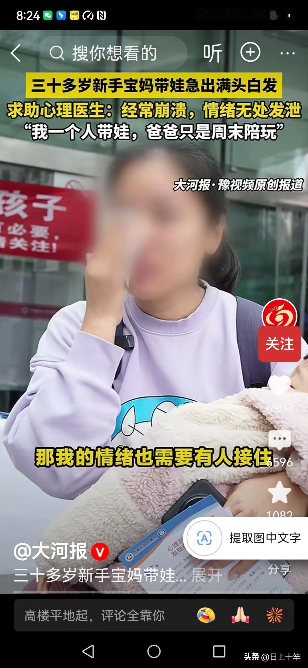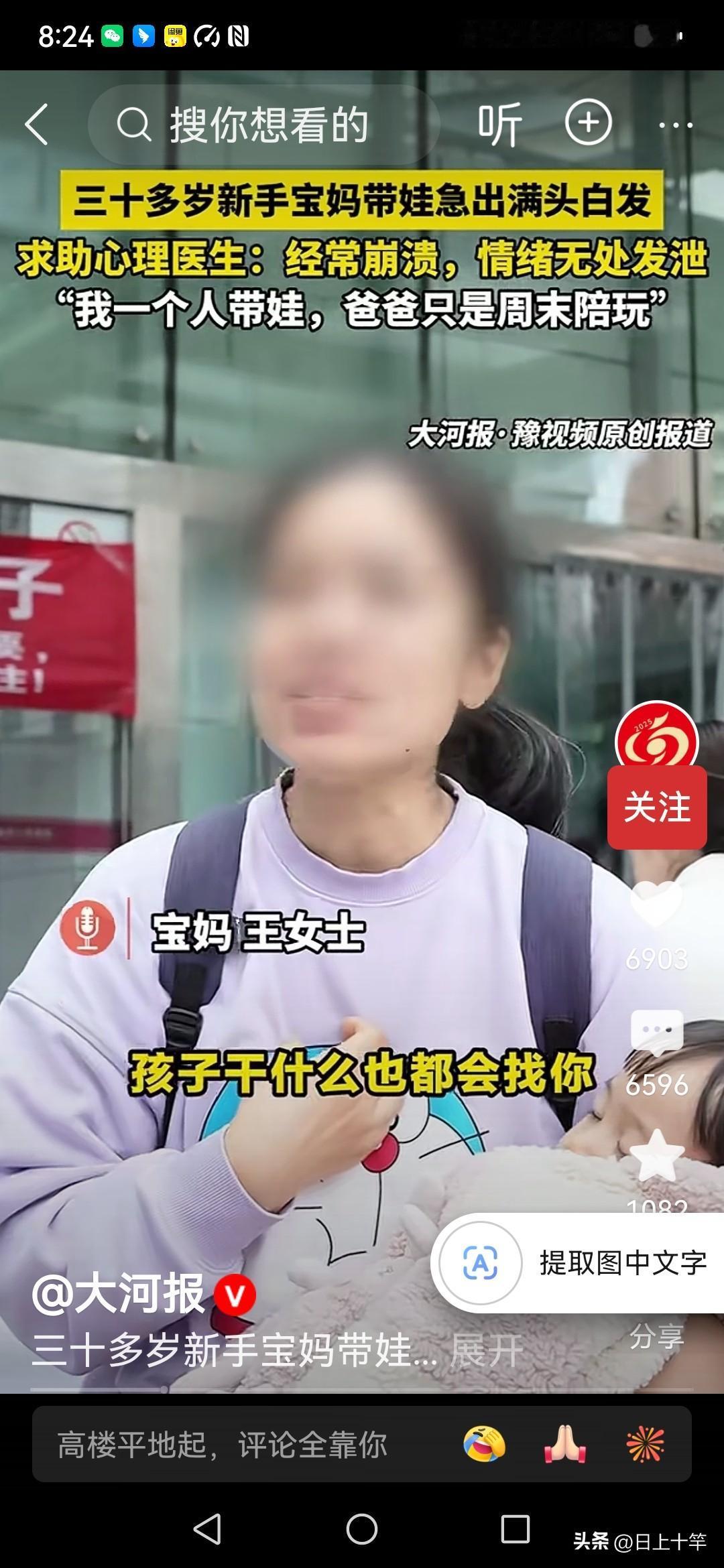三十岁宝妈,孩子才两岁,已经满头华发丛生了!这是她来寻求心理咨询的现场,面对记者采访,不停地倒苦水。 从孩子出生,她就感觉没人理解她,在乎她;大家的中心和关注点都在孩子身上。 爸爸参与照顾孩子很少,即使周末在家也就是陪孩子玩一会,而孩子有事都是找妈妈,这让她更有压力,感觉没有了自我! 这位宝妈哭述,现在自己的情绪没人在乎,没人能听她倾诉,她也需要自己的情绪能被人接住,如果没人能接住,她就只能发泄在孩子身上,所以现在孩子也没有安全感! 从视频中看得出来,这位宝妈的确非常辛苦和憔悴,事实上很多刚生孩子的妈妈是很容易得产后抑郁的,这时候需要非常小心注意呵护好妈妈的情绪。 只有妈妈情绪好了,孩子才能得到最好的照顾,不要本末倒置,把重心放到孩子身上,其实妈妈才是最重要的那一个!