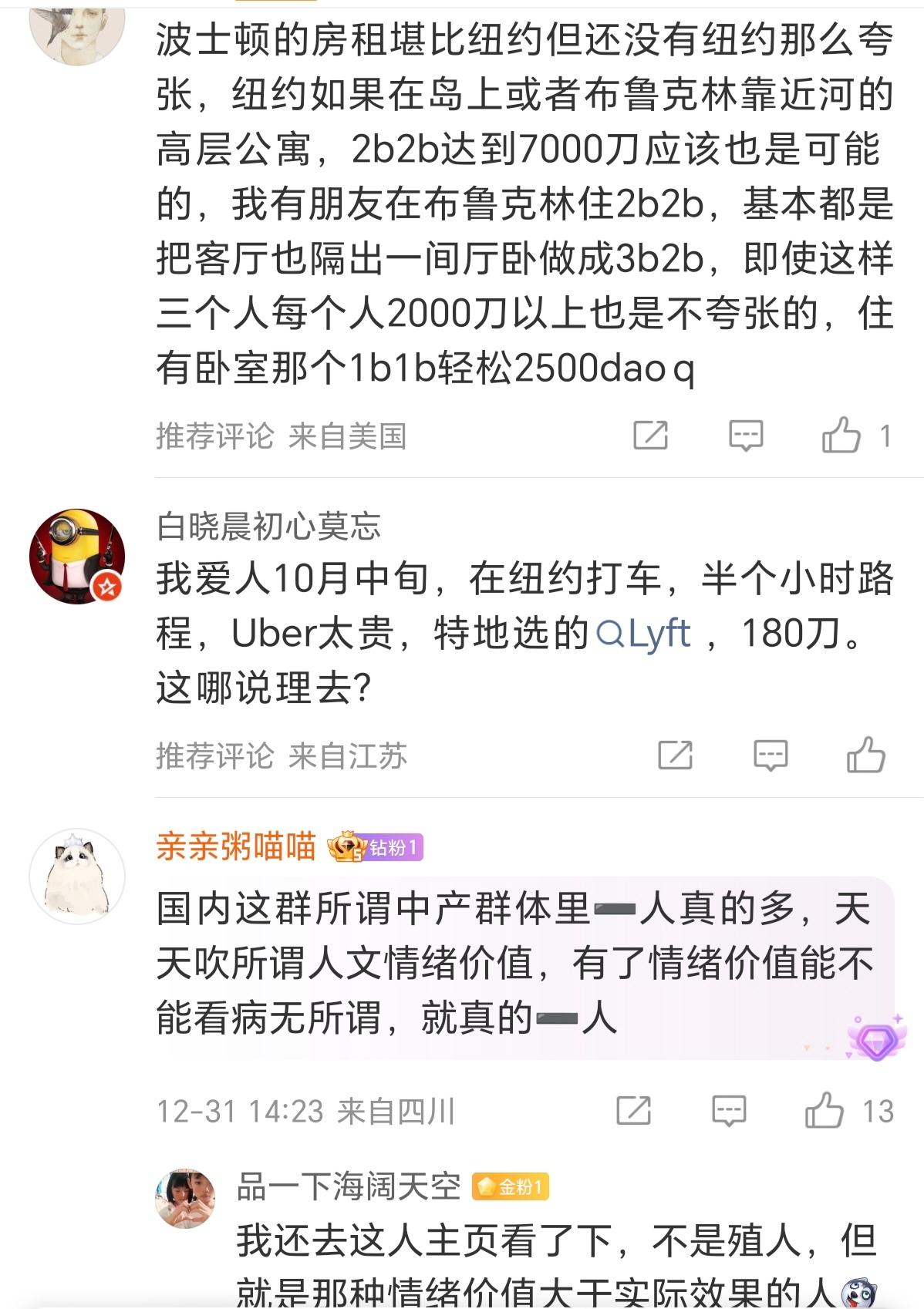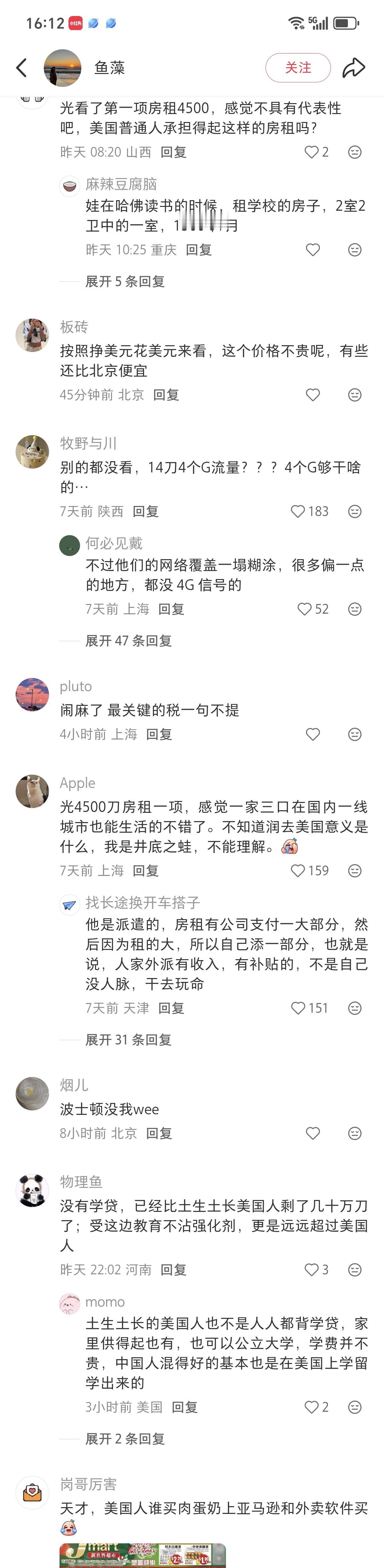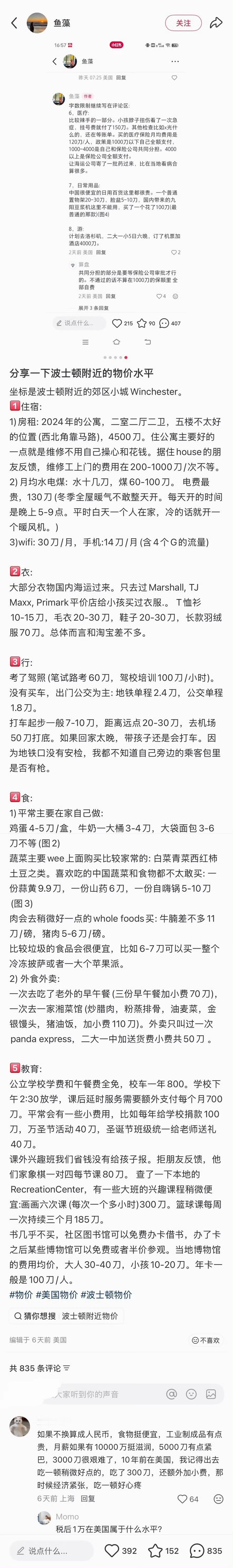 如果美国人看到这个在美国波士顿出差上班的中国女子在美国如此的消费,估计人都要麻了。 光租金都要4500美元(两室两厅,公司报销一半),这比美国人的中位收入3900美元(税后仅2500美元)都高。 在国外请假除了要花费时间,还要花费1000美元。这要是搁在国内当天开不到都已经爆了,上网哭诉了。 看个病,浪费了四五个小时,什么都没治,1255费用自付1000?这保险费只报了挂号费吗?还只是得到了不是“流水线”般待遇的情绪价值。 省流:忽略掉货币数字符号,和国内消费除了牛奶、汽车、手机外,物价上大差不差。 房租4500,公司出一半,没车,不吃快餐食品,不购物,无学贷,有中国背景的高薪工作。说实话,参考价值不大。这根本就不是正常美国人的真实生活,缺乏研究性。 下一个!