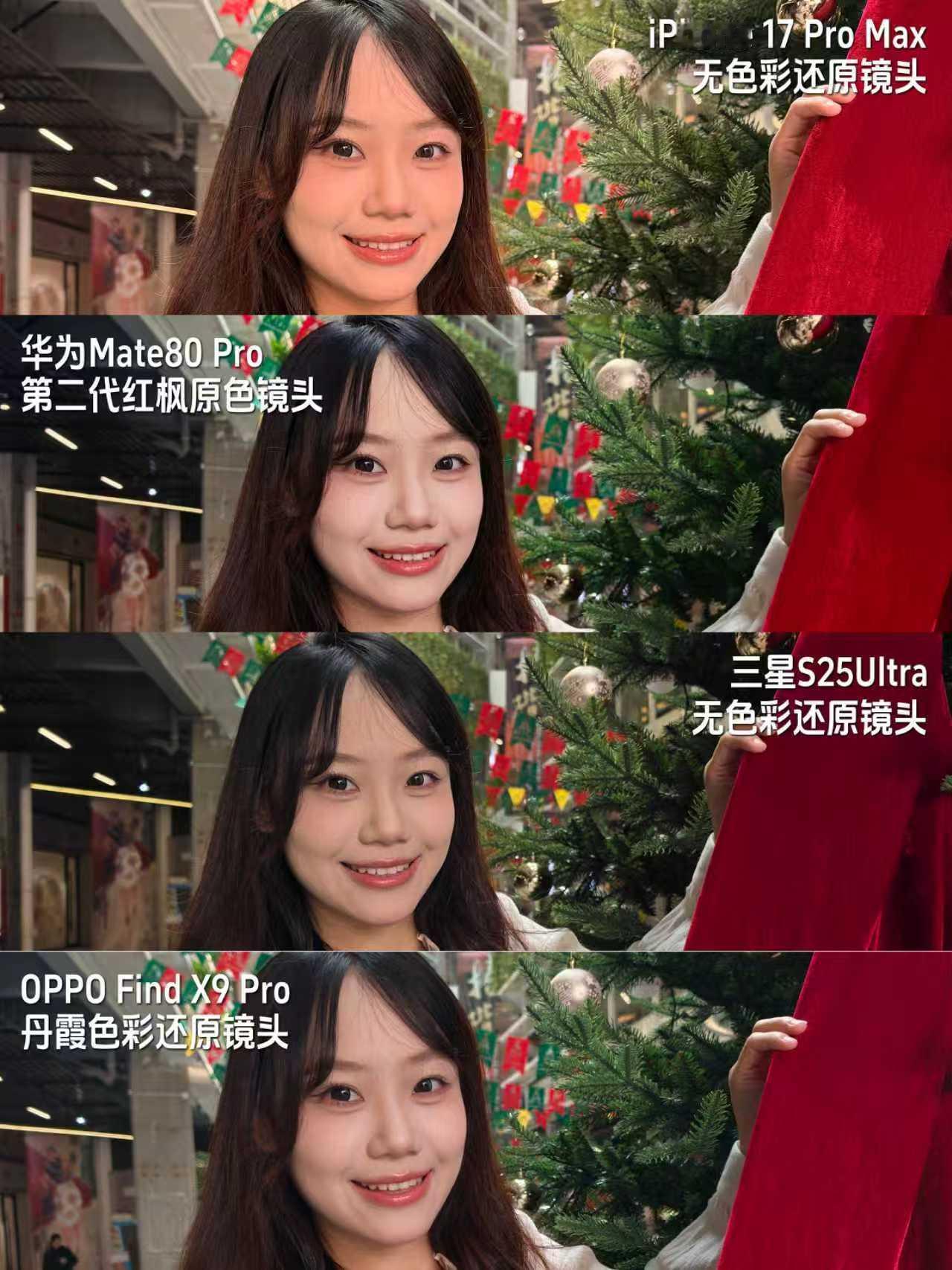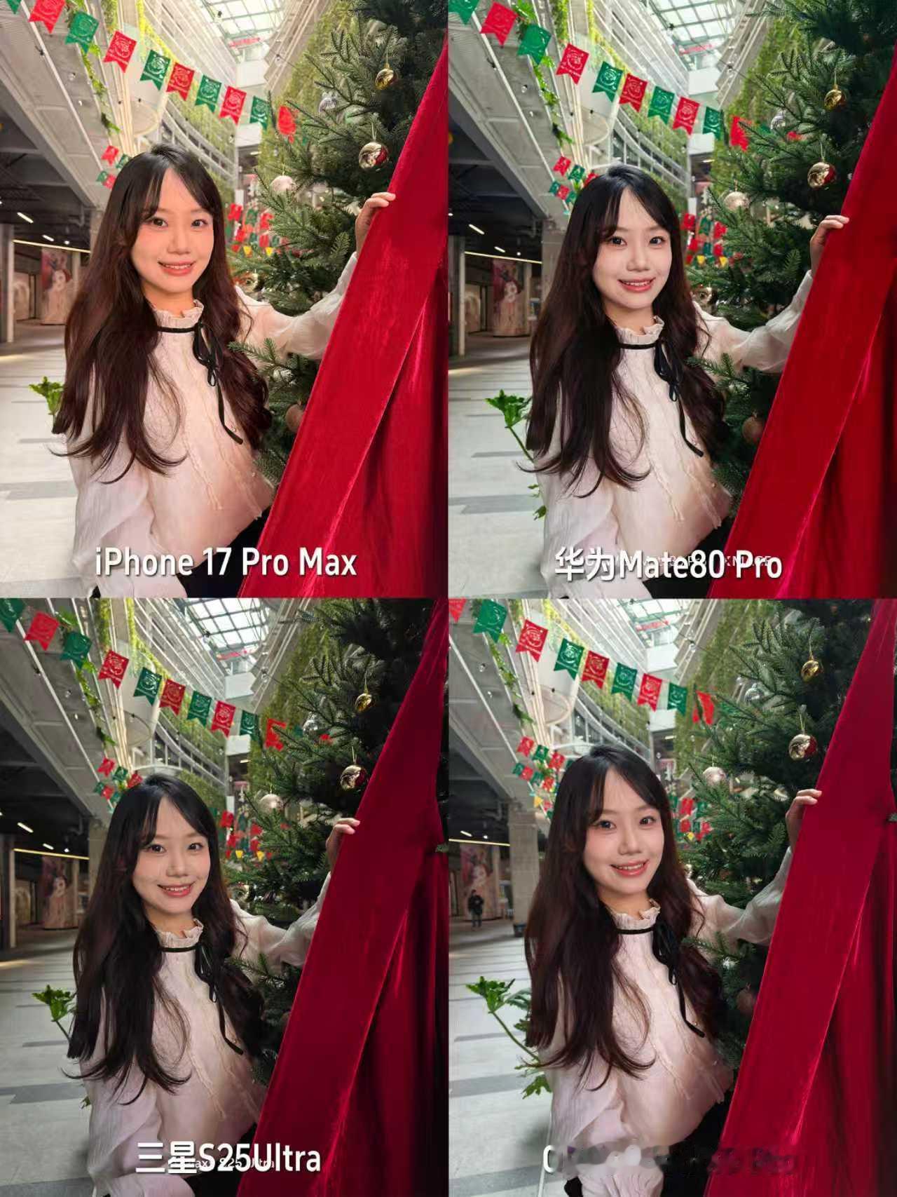 跨年夜来了!!哪台手机拍照合你心意 🎇2026年来啦!!元旦跨年夜大家都有啥安排? 出去吃漂亮饭的话当然要美美出片啦,直接来实拍对比一波,看看哪款高端影像旗舰人像照片更好看~ ⭕iPhone 17 Pro Max 新一代苹果有美颜了,观感会比之前好很多,整体画面偏饱满明亮一些,不过美颜效果跟国产比,还是有进步空间的。 ⭕华为Mate80 Pro 华为的会更接近肉眼观感,看着更真实一些,女生面部更白皙但也不会假假的,清晰度、虚化效果这些也都很ok。 ⭕三星S25 Ultra 国际大厂三星的人像拍摄效果是比较偏真实的风格的,画质这块很到位,发丝都很清晰,美颜磨皮的效果也是有的。 ⭕OPPO Find X9 Pro OPPO在人像方面还是比较权威的,整体观感自然生动,虚化效果也很优秀,哈苏2亿和丹霞色彩还原镜头加持下,面部的美颜效果也是刚刚好,白里透红,女生应该会比较喜欢这种效果。 📷都是影像大旗舰了,画质清晰度这些都是很不错的,主要是色彩的差异 我个人是更喜欢华为跟OPPO的风格的,这两都有新一代色彩镜头,华为的红枫和OPPO的丹霞,都能让色彩更准确自然,比没有色彩镜头的更有优势一些。另外OPPO还官宣了Find X9系列参与新国补,有减500、加赠礼盒和24期等, 还是蛮有吸引力的🤔 大家觉得,哪款拍照效果更好呢?