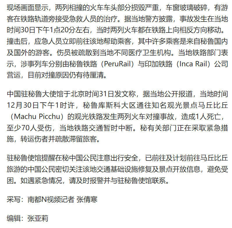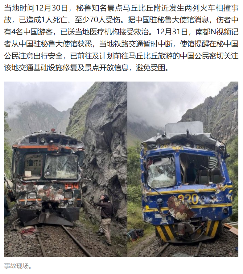 #秘鲁火车相撞致4中国游客受伤#【秘鲁知名景点附近火车相撞致中国游客受伤现场曝光!交通中断】#秘鲁两火车迎头相撞现场曝光#当地时间12月30日,秘鲁知名景点马丘比丘附近发生两列火车相撞事故,已造成1人死亡、至少70人受伤。据中国驻秘鲁大使馆消息,伤者中有4名中国游客,已送当地医疗机构接受救治。12月31日,南都N视频记者从中国驻秘鲁大使馆获悉,当地铁路交通暂时中断,使馆提醒在秘中国公民注意出行安全,已前往及计划前往马丘比丘旅游的中国公民密切关注该地交通基础设施修复及景点开放信息,避免受困。现场画面显示,两列相撞的火车车头部分损毁严重,车窗玻璃破碎,有游客在铁路轨道旁接受急救人员的治疗。据当地警方披露,事故发生在当地时间30日下午1点20分左右,当时两列火车都在铁路上向相反方向移动。撞击后,应急人员立即前往该地帮助乘客,其中许多乘客是来自秘鲁国内及国外的游客。伤员被疏散到当地不同医疗卫生机构。当地铁路部门表示,涉事列车分别由秘鲁铁路(PeruRail)与印加铁路(Inca Rail)公司营运,目前对撞原因仍有待厘清。中国驻秘鲁大使馆于北京时间31日发文称,据当地公开报道,当地时间12月30日下午1时许,秘鲁库斯科大区通往知名观光景点马丘比丘(Machu Picchu)的观光铁路发生两列火车对撞事故,造成1人死亡,至少70人受伤,当地铁路交通暂时中断。秘有关部门正在采取紧急措施,转运伤者并疏散滞留旅客。驻秘鲁使馆提醒在秘中国公民注意出行安全,已前往及计划前往马丘比丘旅游的中国公民密切关注该地交通基础设施修复及景点开放信息,避免受困。如遇紧急情况,请及时报警并与驻秘鲁使馆联系。采写:南都N视频记者 张倩寒