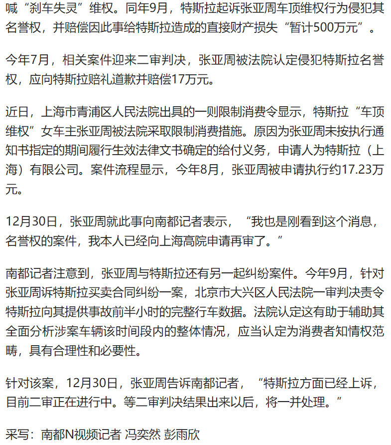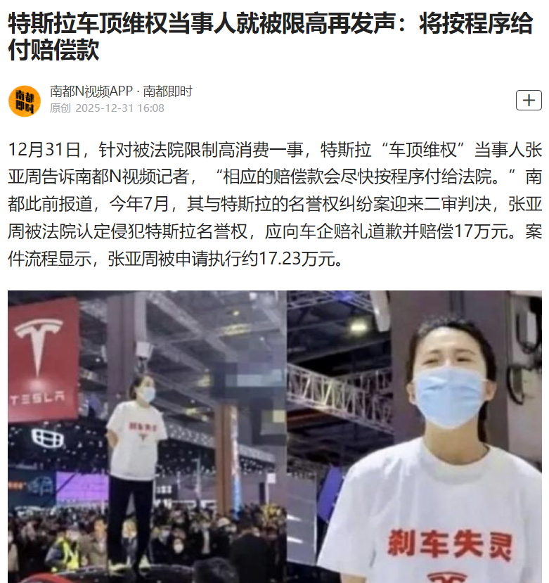 #特斯拉车顶维权女车主再回应被限高#【特斯拉车顶维权当事人就被限高再发声:将按程序给付赔偿款】12月31日,针对被法院限制高消费一事,特斯拉“车顶维权”当事人张亚周告诉南都N视频记者,“相应的赔偿款会尽快按程序付给法院。”南都此前报道,今年7月,其与特斯拉的名誉权纠纷案迎来二审判决,张亚周被法院认定侵犯特斯拉名誉权,应向车企赔礼道歉并赔偿17万元。案件流程显示,张亚周被申请执行约17.23万元。南都此前报道,2021年4月19日,张亚周在上海车展爬上特斯拉车顶大喊“刹车失灵”维权。同年9月,特斯拉起诉张亚周车顶维权行为侵犯其名誉权,并赔偿因此事给特斯拉造成的直接财产损失“暂计500万元”。今年7月,相关案件迎来二审判决,张亚周被法院认定侵犯特斯拉名誉权,应向特斯拉赔礼道歉并赔偿17万元。特斯拉车顶维权当事人就被限高再发声:将按程序给付赔偿款