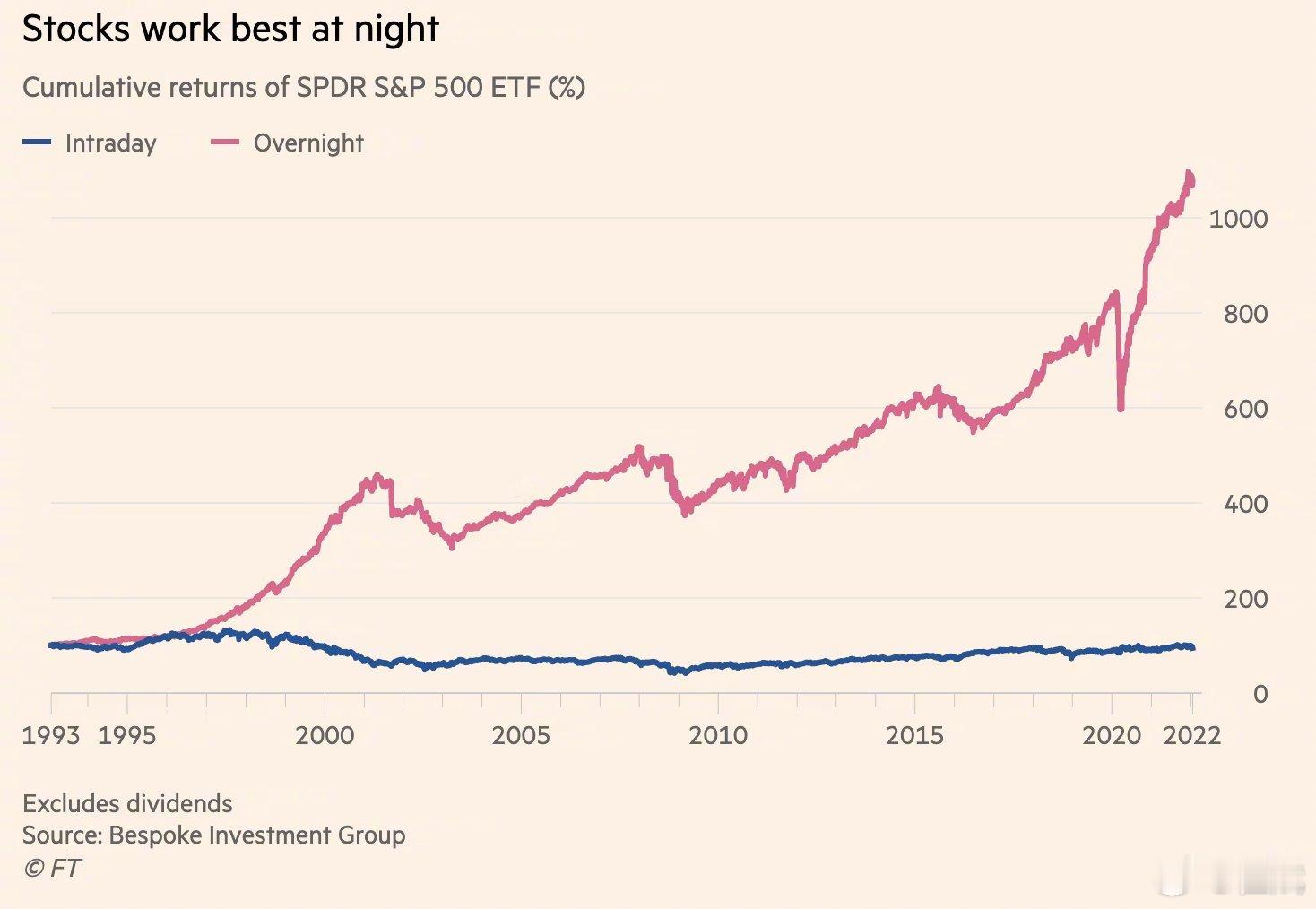今天万霖分享了英国《金融时报》这张图,图的意思,应该是标普的所有涨幅几乎都是在“非交易时间”贡献的,真正的“交易时间”几乎没赚到钱。说明美股内生动力是业绩而且长期下来几乎没有啥内幕交易可言。这个图令人印象深刻!万霖回测过美股和港股,基本结论一致,金融时报的这个统计是对的。学术界也有关于这个现象的研究,叫做“The Overnight Drift”。其中一个重要原因是,业绩都是盘后发布的,可能美股从根本上还是业绩在推动。