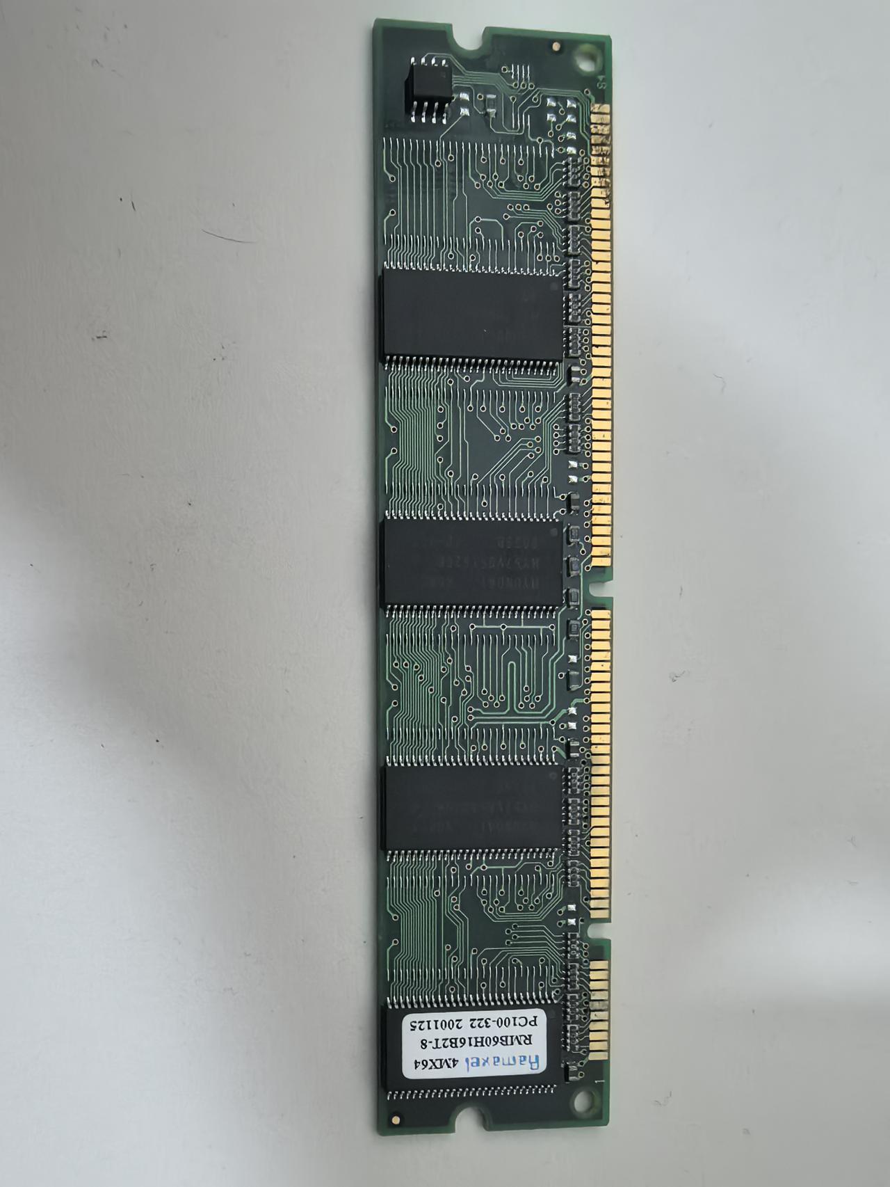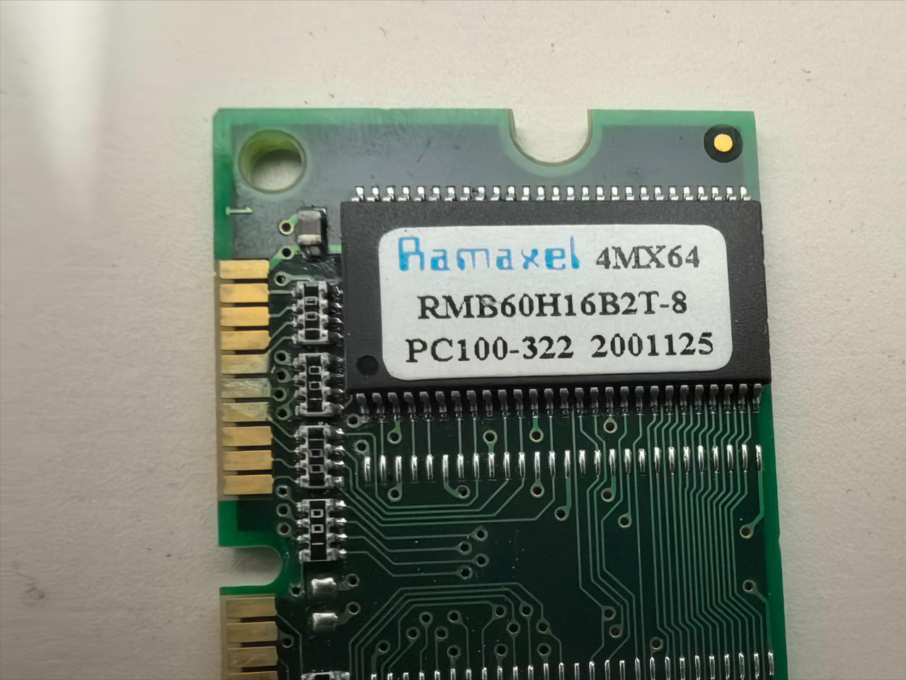 发现一根20年前的内存条,还有什么价值吗? 在旧房子的抽屉里找出一根内存条,型号是 RAMaxel 64MB PC100 SDRAM ,可能是老爸以前的攒台式机富余的。 在2000年左右,一台主流配置的台式电脑(如奔腾III处理器)整机价格在8000-12000元人民币左右,其中一根品牌64MB内存大约在300-400元左右。 现在电脑的内存起步就是8G,但64M在20多年前算是很先进的内存了。 不知道这内存条还有什么价值,可能只有作为工业艺术品怀旧了。