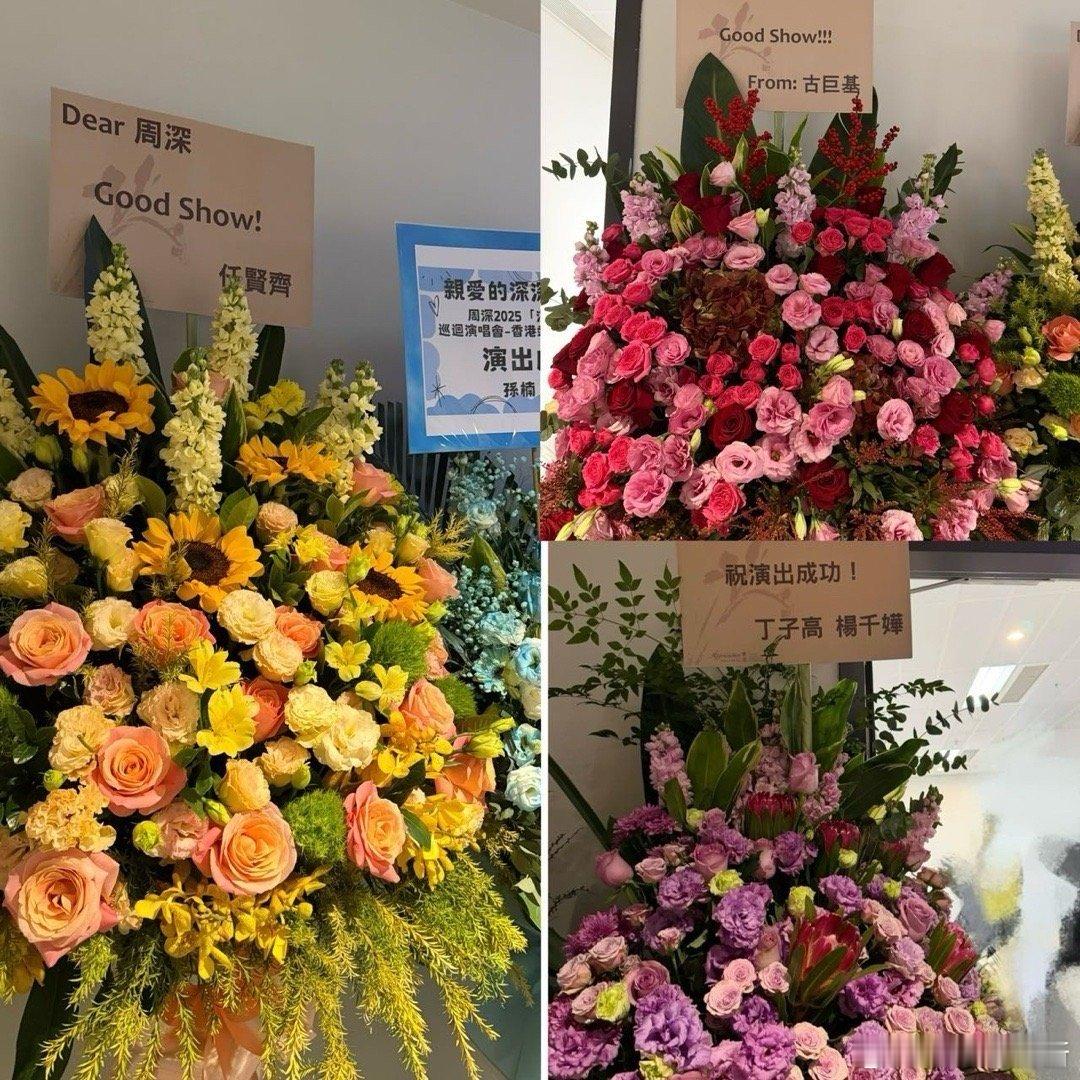 周深的后台好多艺人啊 看到后台那么多前辈和朋友送来的花篮,从刘德华、张学友到熟悉的“生米”刘涛,真心为周深高兴。这不只是排面,更是一路走来用歌声和人品攒下的好人缘。
