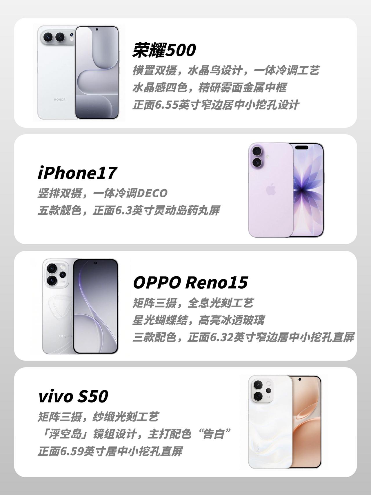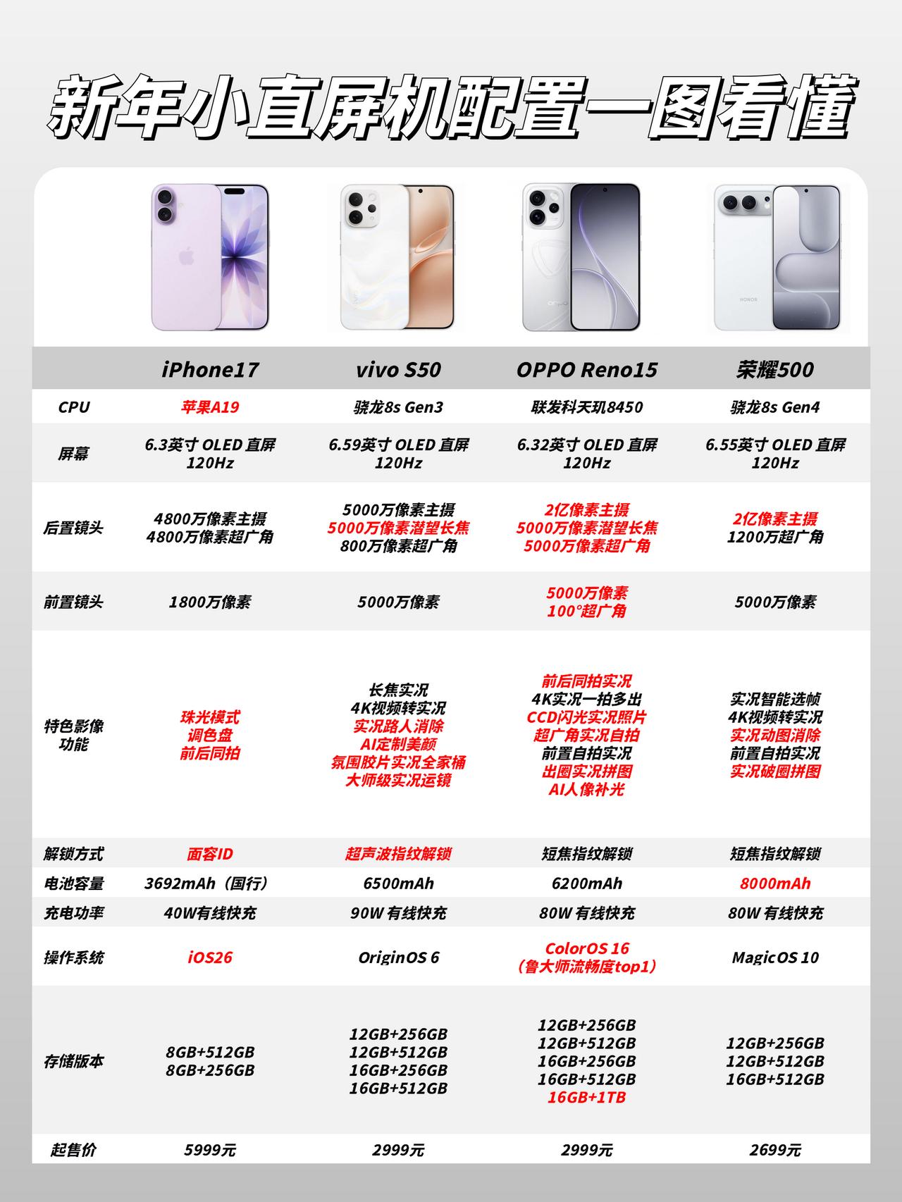 四大热门小直屏机设计对比,你喜欢谁? 颜值党快帮我看看!新年小直屏机咋选 iPhone17、OPPO Reno15、荣耀500、vivo S50三款机型 ✔️iPhone17是竖置的双摄 ✔️Reno15是矩阵模组 ✔️500是横置环形跑道 ✔️S50是矩阵模组 四款机型三种风格设计,单纯看设计的话,你觉得哪款更出彩呢? ⚙️核心配置差异: ✅荣耀500电池大,iPhone17性能强,Reno15实况玩法是四款机型里樶多的~ ✅Reno15和iPhone17分别是6.32/6.3英寸直屏,手感会更好; ✅Reno15和荣耀500是2亿像素主摄,成像更清晰; ✅Reno15和S50拥有潜望镜头的,能拍得更远。 镜头部分,Reno15没有凑数镜头,主摄2亿和5000万像素潜望长焦、5000万像素超广角,其他几款有双摄的,也有超广角是800万像素的,没有它那么均衡。 不过综合价格考虑,你们觉得哪个更好? iPhone17 OPPOReno15 荣耀500 颜值手机 手机推荐 手机对比 换机攻略 拍照手机