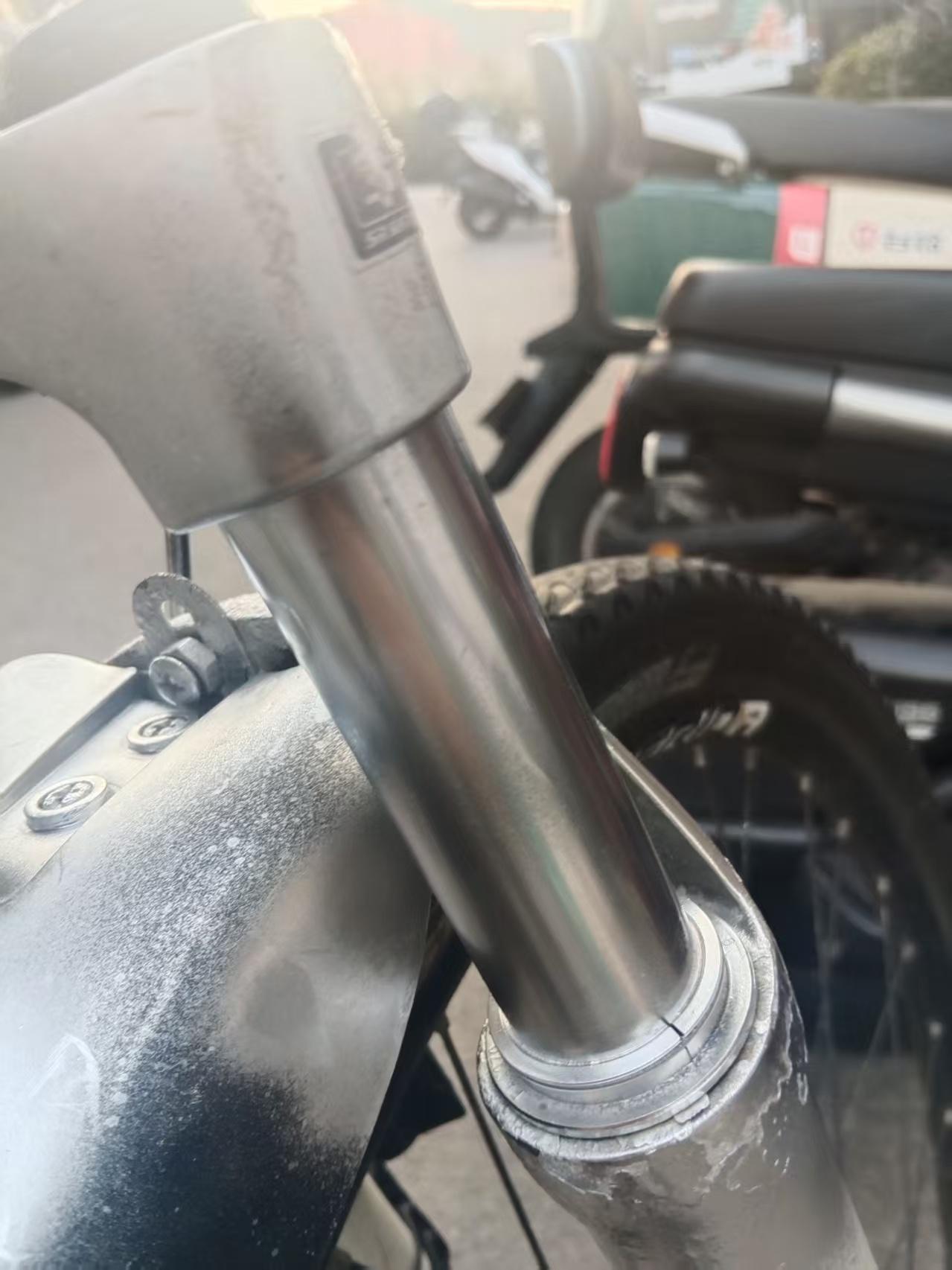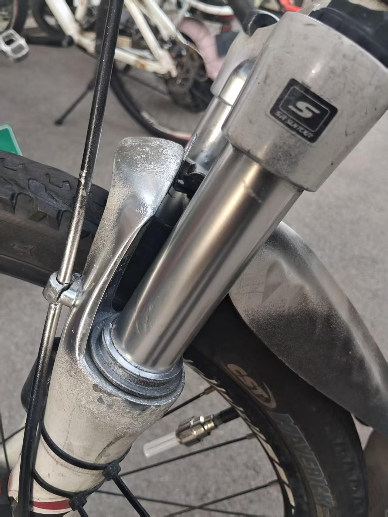 自行车前叉减震功能不好用了,关键还生锈了 网上找到不少去锈的办法,但后来发现还是砂纸好用,几下就光亮如初。但是过一段时间还是一层锈,不能去根儿。 从网上买了镀铬喷剂,然后用砂纸打磨干净,用塑料袋把周边简单遮挡好简单喷几下就搞定。 等干透了检查了一下发现还有锈点没遮住,看来应该反复喷几次。 补喷的时候忘了做遮挡,挡泥板沾了不少。 前后对比一下,效果不错吧? 注:喷之前没拍照,就找了张网上的照片,实际生锈比这个严重。