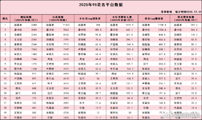 95花各平台数据2025年均值盘点,赵露思全方面遥遥领先~