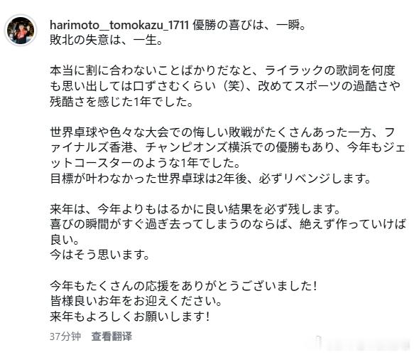 张本智和 251231ins"冠军的喜悦是瞬间的。落败的失意是一生的。这一年,我再次感受到了体育运动的残酷与严苛,甚至会无数次回想并哼唱起《紫丁香》的歌词,感叹着“真的净是些得不偿失的事情啊”(笑)。在世乒赛和各种大赛中,有过许多令人懊悔的失利;在香港总决赛和横滨冠军赛上,也获得了冠军。今年依然是像过山车一样的一年。未能实现的目标,世界乒乓球赛,两年后,我一定会复仇。明年,我一定会取得远比今年更好的成绩。如果喜悦的瞬间总是转瞬即逝,那就去不断创造(新的喜悦)就好。我现在是这么想的。今年也非常感谢大家的热情声援!祝大家新年快乐。明年也请多多关照!"(机翻)cr:harimoto__tomokazu_1711