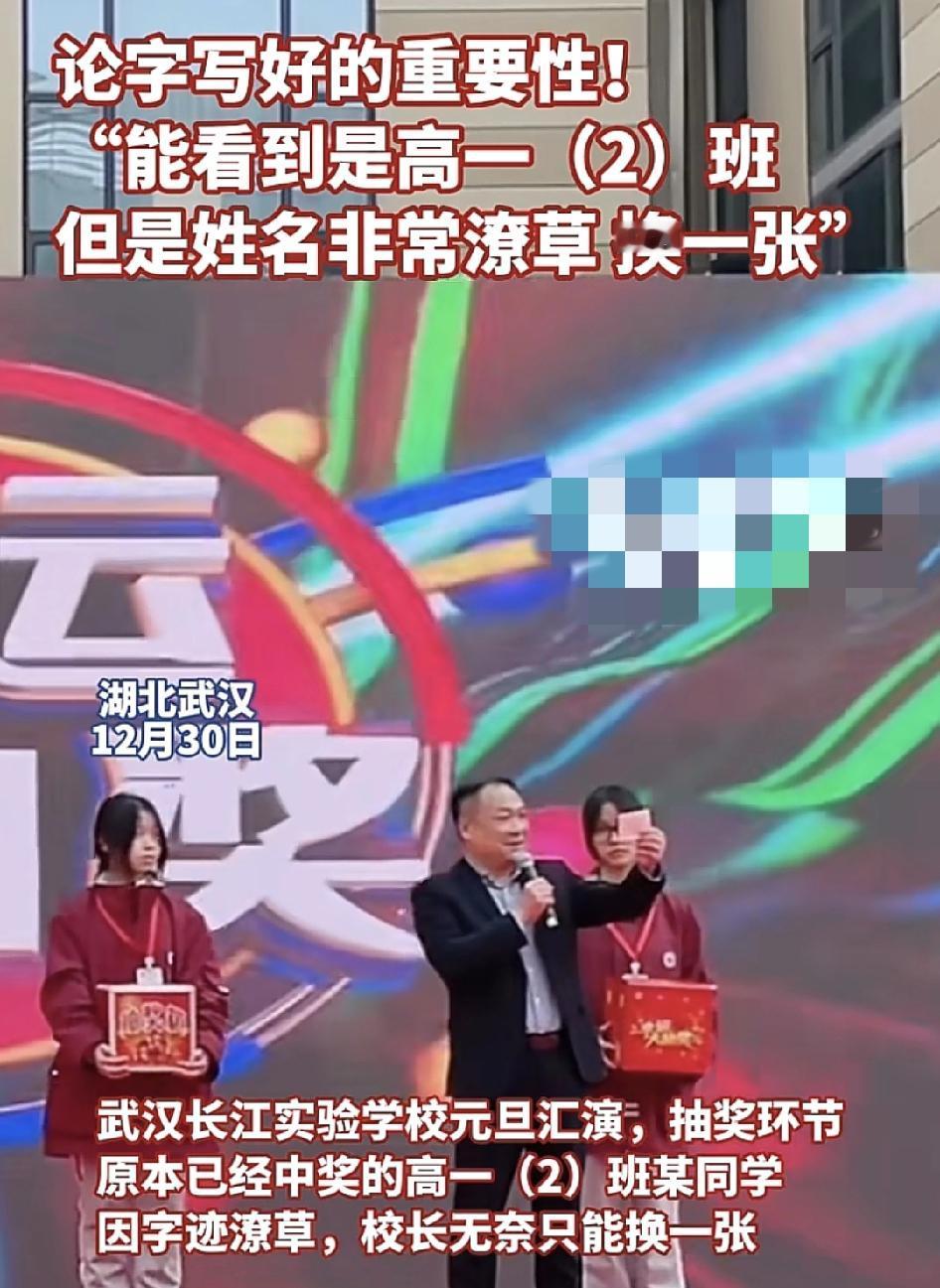 湖北武汉一学校举行元旦汇演时,在抽奖环节,校长亲自抽奖,第1次抽中了高一某班的同学,因为字写的太过于潦草,校长无奈放弃再抽检一次。第2次抽中的一个班级的学生,也是因为最后一个字写不清楚,差点与labubu奖品擦肩而过。现场也引来了师生们的大笑,但也引发了现代教育,显示的重要性,很多人说现在孩子们都喜欢玩手机,写字的时间确实是不如以前那个年代了。