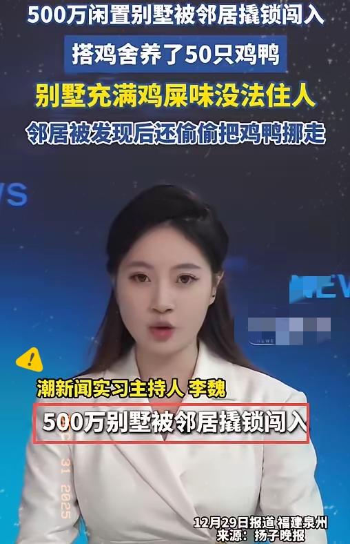 “必须严惩!”福建一男子冬至回老家祭祖,竟发现自家500万建造,长期闲置的别墅,竟被邻居撬锁闯入,并私自改造成了地下鸡舍!导致屋里搞得臭气熏天,墙壁地面糊满粪便。气得男子直接报警!网友:邻居脸皮也太厚了! 一句“空着也是空着”,真把别人的500万别墅当成自家养殖场?撬锁闯入、私搭鸡舍还偷搬煤气罐,这哪是“废物利用”,分明是没底线的违法侵占! 邻居老林拿“乡下老规矩”当挡箭牌,却忘了法律里从没有“别人的东西能随便占”这一条。房屋空置不等于所有权失效,这种揣着明白装糊涂的占便宜心态,早该被法律狠狠敲打。 更气人的是被发现后还屡教不改,转移鸡鸭还偷拿东西,完全没把他人财产和法律当回事。这事绝不是个案,它戳破了“熟人社会”里的歪理:人情不能凌驾于产权,乡规抵不过国法。 你觉得这种邻居除了赔偿,还该不该承担刑事责任?
