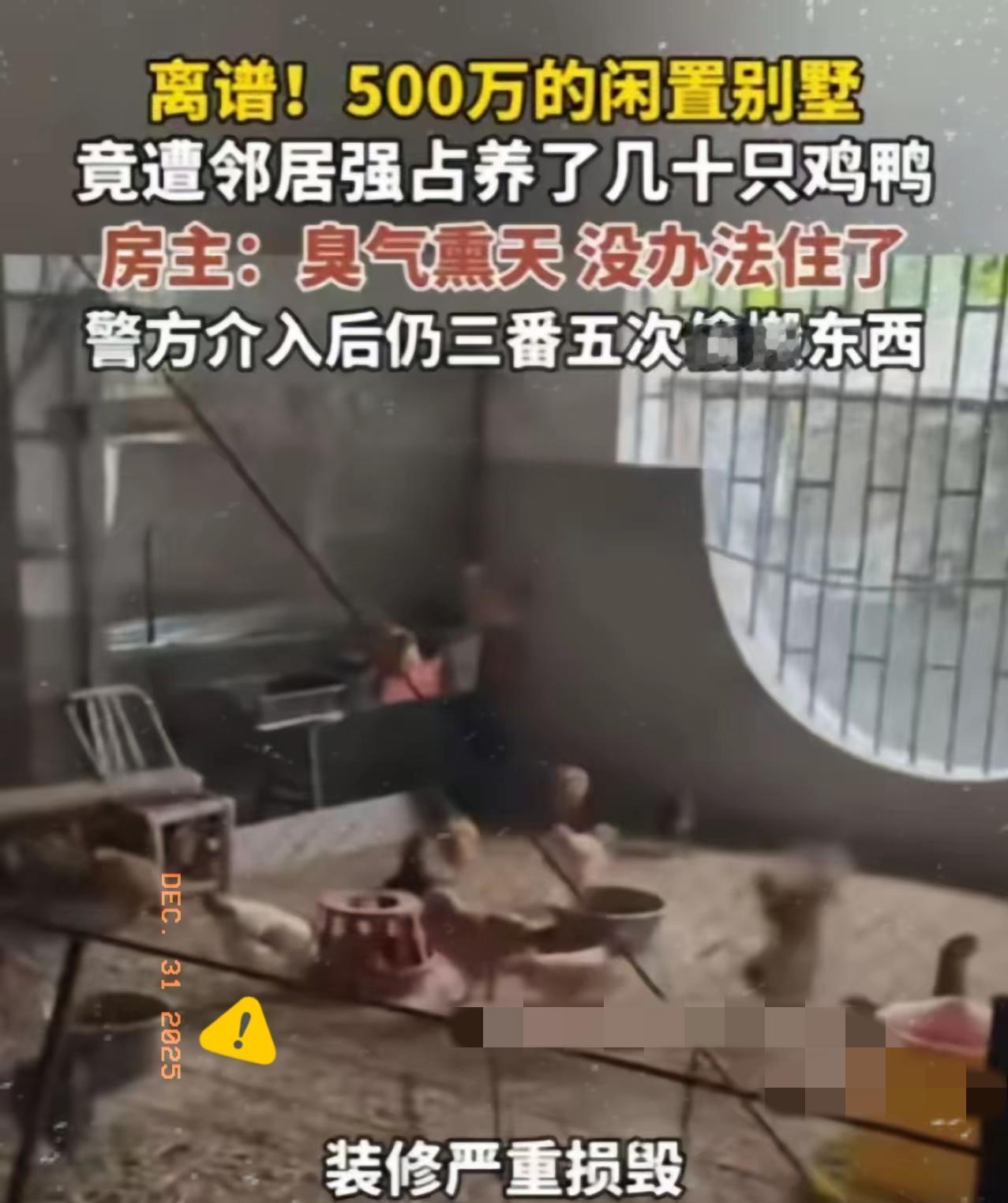 “脸都不要了!”福建一男子回老家祭祖,意外发现闲置多年的别墅里居然有动静,看了一下,直接气到浑身发抖,当场就报了警! 他那栋好好的别墅,居然被人当成鸡舍了!院子里、客厅里到处都是鸡,地上全是鸡粪,原本干净的地板、家具上全是污渍,好好的一栋房子,被造得不成样子。 大哥这火气“噌”地一下就窜到了头顶,不用想都知道,肯定是周边的邻居干的! 这哪是占小便宜,分明是没底线没规矩!房子闲置不等于无主,私闯民宅还搞破坏,已经踩了法律红线。邻居们揣着明白装糊涂,觉得房主远在外地管不着,就把别人的资产当成自家的养殖场,这种占便宜的心思也太龌龊了。 网友们气得跳脚,不是心疼别墅,是怒怼这种没边界感的行为。这年头谁还没个闲置物件,要是都这么随便占,那还有啥安全感可言? 尊重从来不是口头说说,是不碰别人的东西,不越法律的雷池。你觉得这种邻居该赔多少,才能让他长记性?