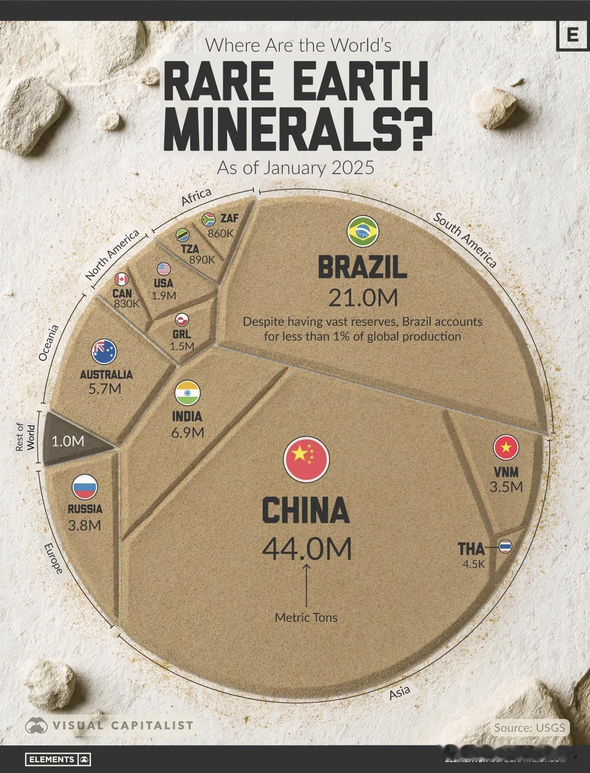《经济时报》12月29日报道,印稀土储量排名全球第三,但实际产量仍受采矿业结构性瓶颈制约。数据显示,印稀土氧化物储量约690万吨(6.9 million tonnes),占全球的6-7%,仅次于中国的4400万吨(44 million tonnes)和巴西的2100万吨(21 million tonnes)。然而,印2024年稀土产量仅2900吨,占全球产量不足1%,同期中国产量达27万吨。分析指出,与中国相比,印稀土产业发展在监管、加工能力和价值链整合方面存在巨大差距。监管层面,印稀土资源主要分布在富含独居石的沿海沙矿,由于伴生放射性元素钍,相关开采加工受到严格监管约束。此外,印稀土生产长期由印稀土有限公司(IREL)垄断,该公司视稀土为副产品而非战略资源,导致开发推进缓慢、效率偏低。加工能力层面,中国掌控全球约90%的稀土精炼产能,几乎垄断重稀土元素加工环节,在产业链中占据绝对优势,而印加工精炼能力十分有限,年产量仅数千吨。