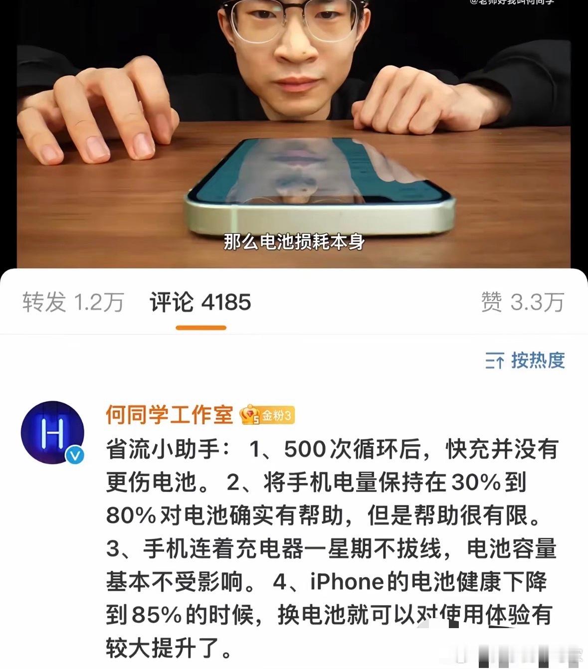 我不知道这种谣言还要传多久,何同学早就实测过了,不管你怎么用什么方式充电都不会严重伤害电池的寿命,电池维持在30%-80%确实对电池有帮助,但是微乎其微长期手机充电至100%会损伤电池