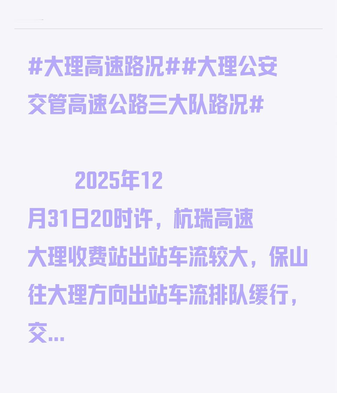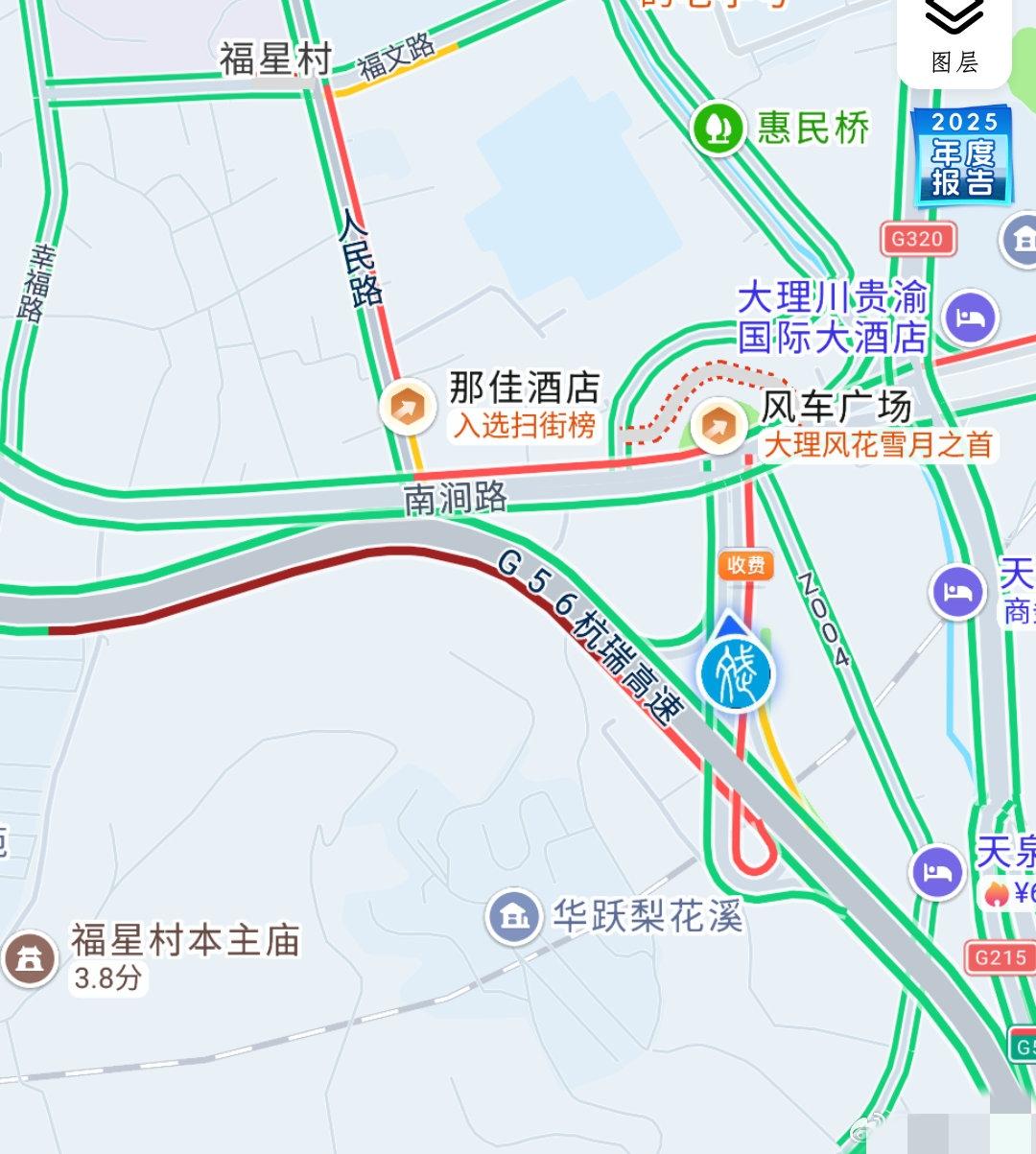2025年12月31日20时许,杭瑞高速大理收费站出站车流较大,保山往大理方向出站车流排队缓行,交警在收费站全力疏导。 建议保山往大理车辆计划从大理收费站出站车辆提前从顺濞、平坡收费站驶出高速公路,或在塘子埔路段(江风寺立交)往昆楚大高速(G5621)绕行至下一个收费站驶出高速路。 已在大理收费站附近排队车辆,可继续向前行驶至凤仪收费站驶离高速公路。 请途经各路面管控点的驾驶员朋友服从现场指挥,请勿争抢、有序通行。 大理路况 云南高速路况