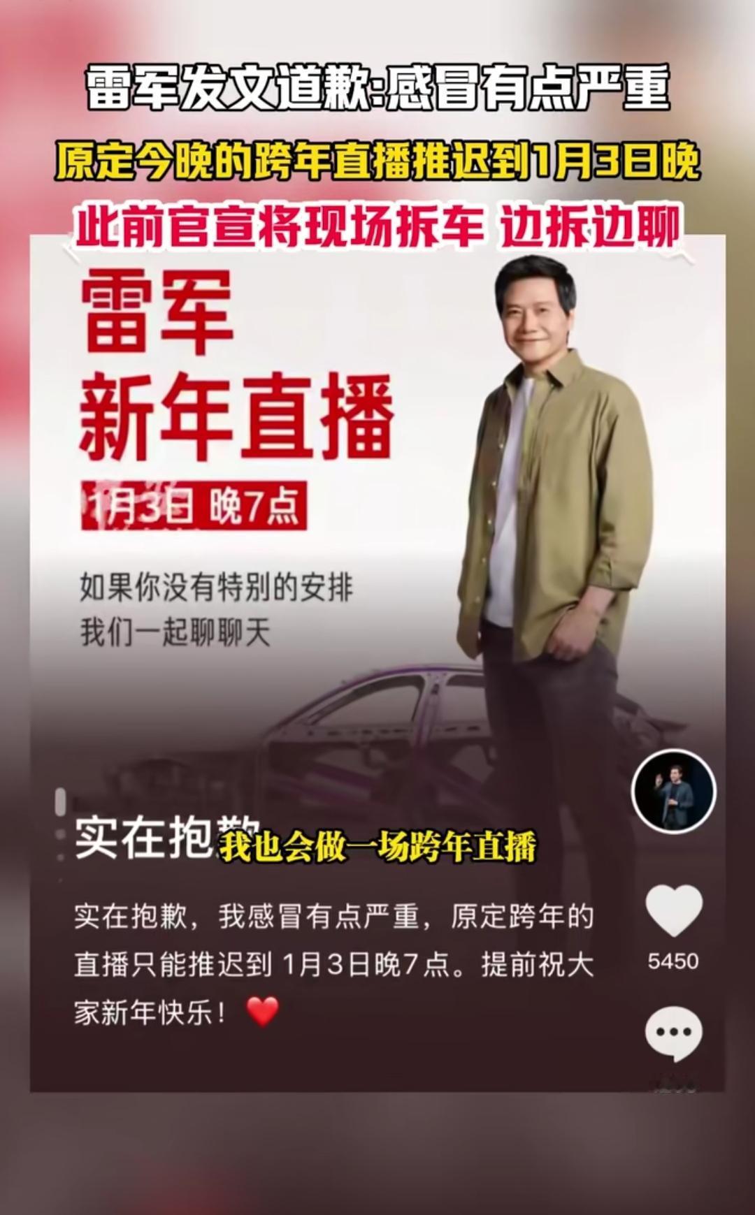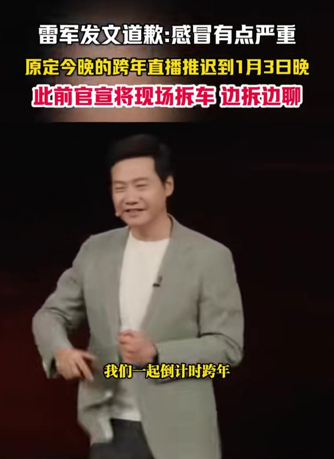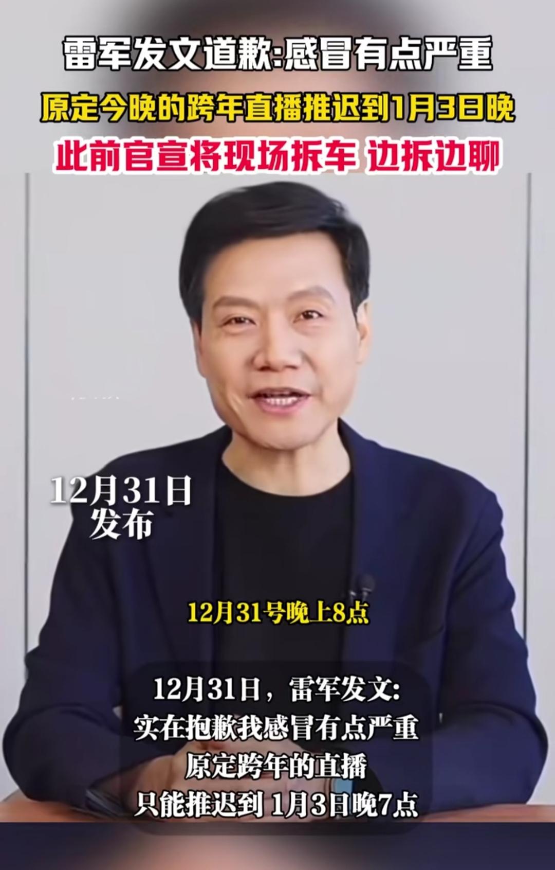谁能想到,数码圈盼了好几天的小米YU7拆解直播,临开播前被雷军喊停了?12月31日上午,他带着歉意发文:“感冒严重到说不出话”,把原定于当晚的跨年直播推迟到2026年1月3日,还直接加码15台小米17 Ultra抽奖,没让蹲守的网友空欢喜。 这场直播本是网友和品牌的双向奔赴:大家呼声最高“想拆YU7”,小米立刻响应安排硬核拆解;雷军原本要亲自站台,和工程师一起“边拆边聊”技术。可真到要上场,他没硬撑着“带病营业”,也没找花哨借口,只坦诚“状态不行”,用最实在的方式弥补遗憾。 现在很多品牌总执着于“完美人设”,哪怕负责人累到扛不住,也要硬凹“敬业”模样。但雷军这次的选择恰恰证明:尊重观众从不是勉强出镜的敷衍,而是把真实情况说透、把补偿做到位的诚意。比起无懈可击的“套路”,这种不端着、不敷衍的真诚,才是品牌最该有的温度。