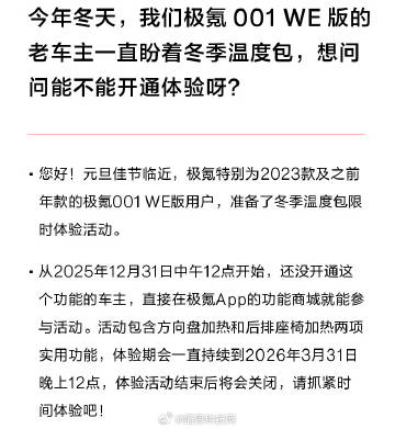 2023 款及之前年款的极氪 001 WE 版车主,可以从 2025 年 12 月 31 日中午 12 点开始,在极氪 App 功能商城参与“冬季温度包限时体验活动”,可免费体验 3 个月方向盘加热、后排座椅加热功能。也就是说,软件锁死方向盘加热、后排座椅加热这俩功能。也可以花钱一次性买断这俩功能。简单点说就是,硬 ...全文