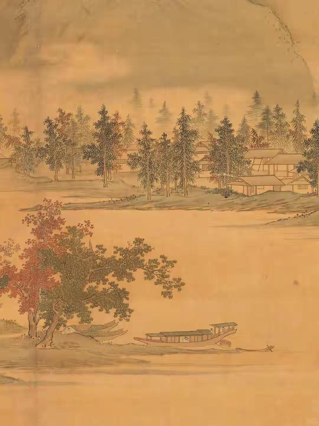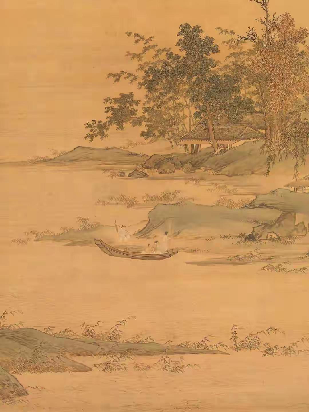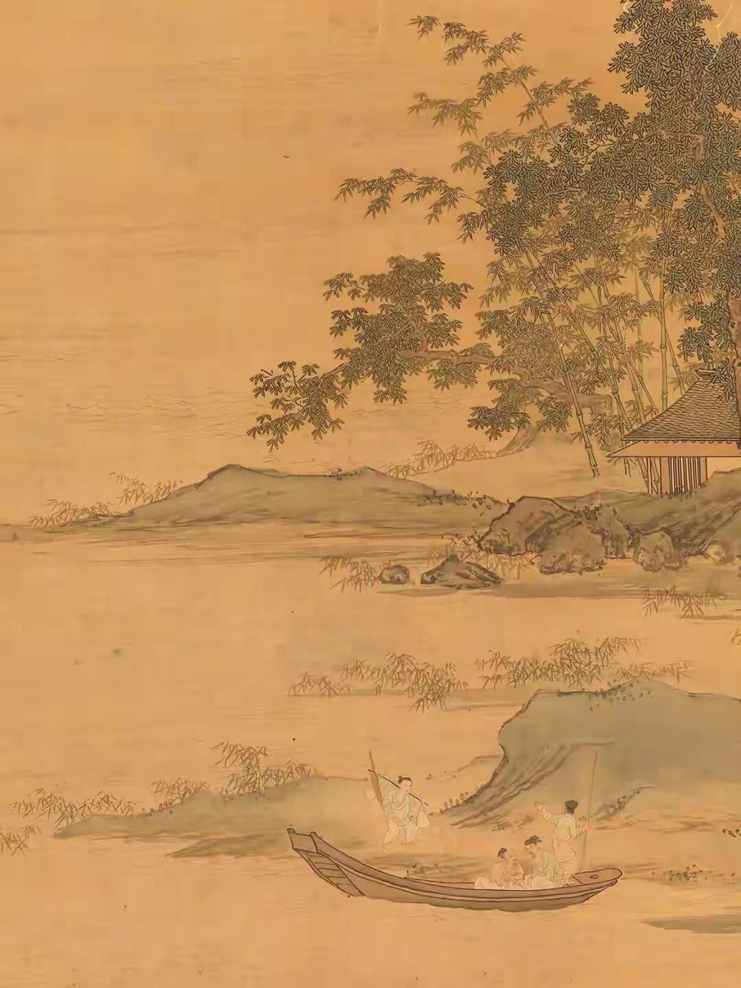 初见仇英《秋江待渡图》纯净版,心神为之凝驻。这位明代天才笔下,秋江澹荡,远山如沐,一叶孤舟静泊岸际,待渡人物衣袂翩然,神情顾盼间气韵生动。林木疏密有致,枝干以细笔勾皴,叶叶分明,仿佛可触其摇曳之姿。通幅设色清丽温润,浅赭、淡青与墨色交融,似有月光浸润其间。构图更见匠心,近水远岫,虚实相应,留白处似有无尽江风与秋思萦绕。仇英以工笔蕴写意,于精微中见广阔,非深谙古法而能独出机杼者,绝难至此境界,令人遥想其作画时,必是身心俱与笔墨同化于这派澄澈秋光之中了。