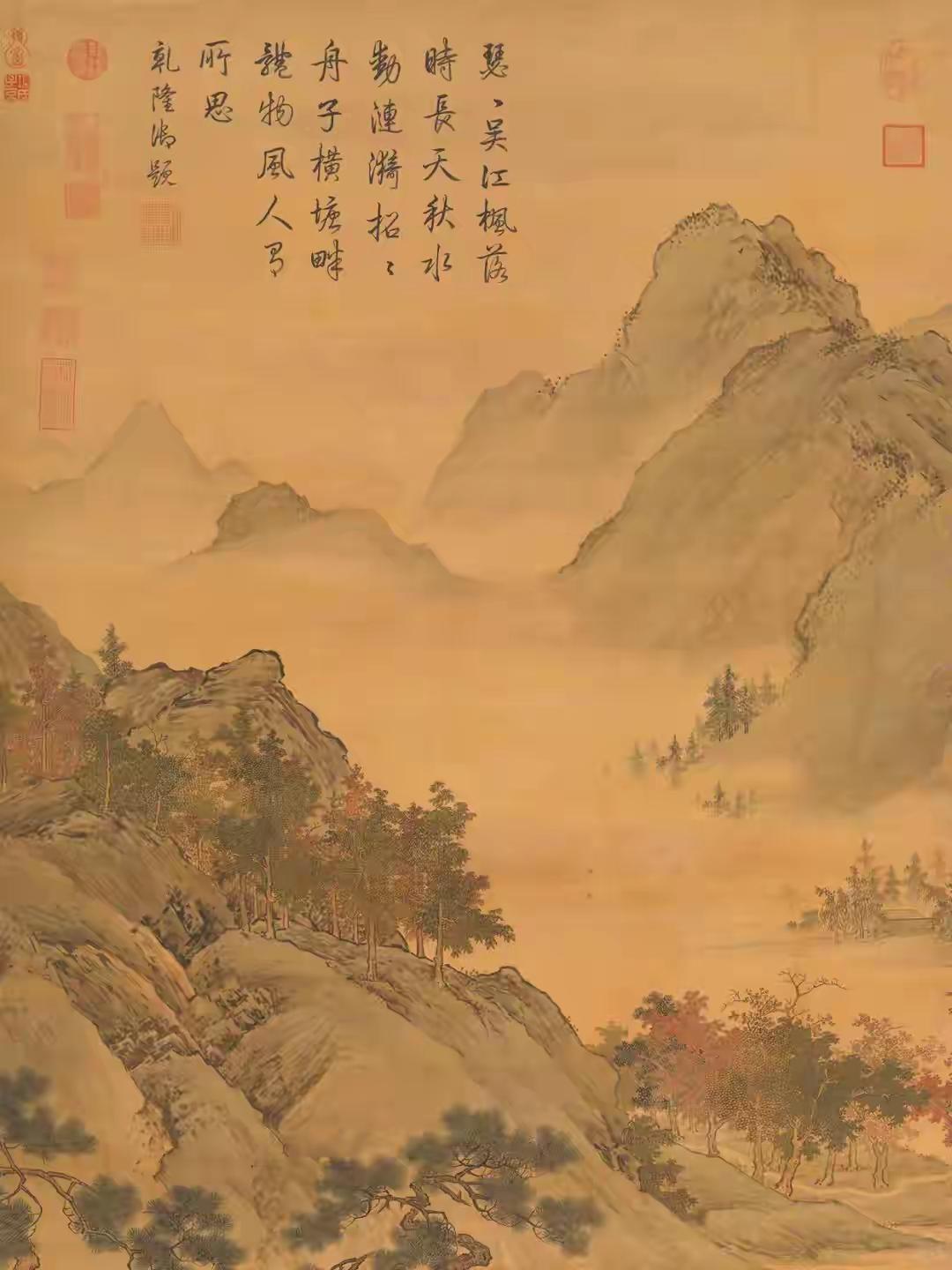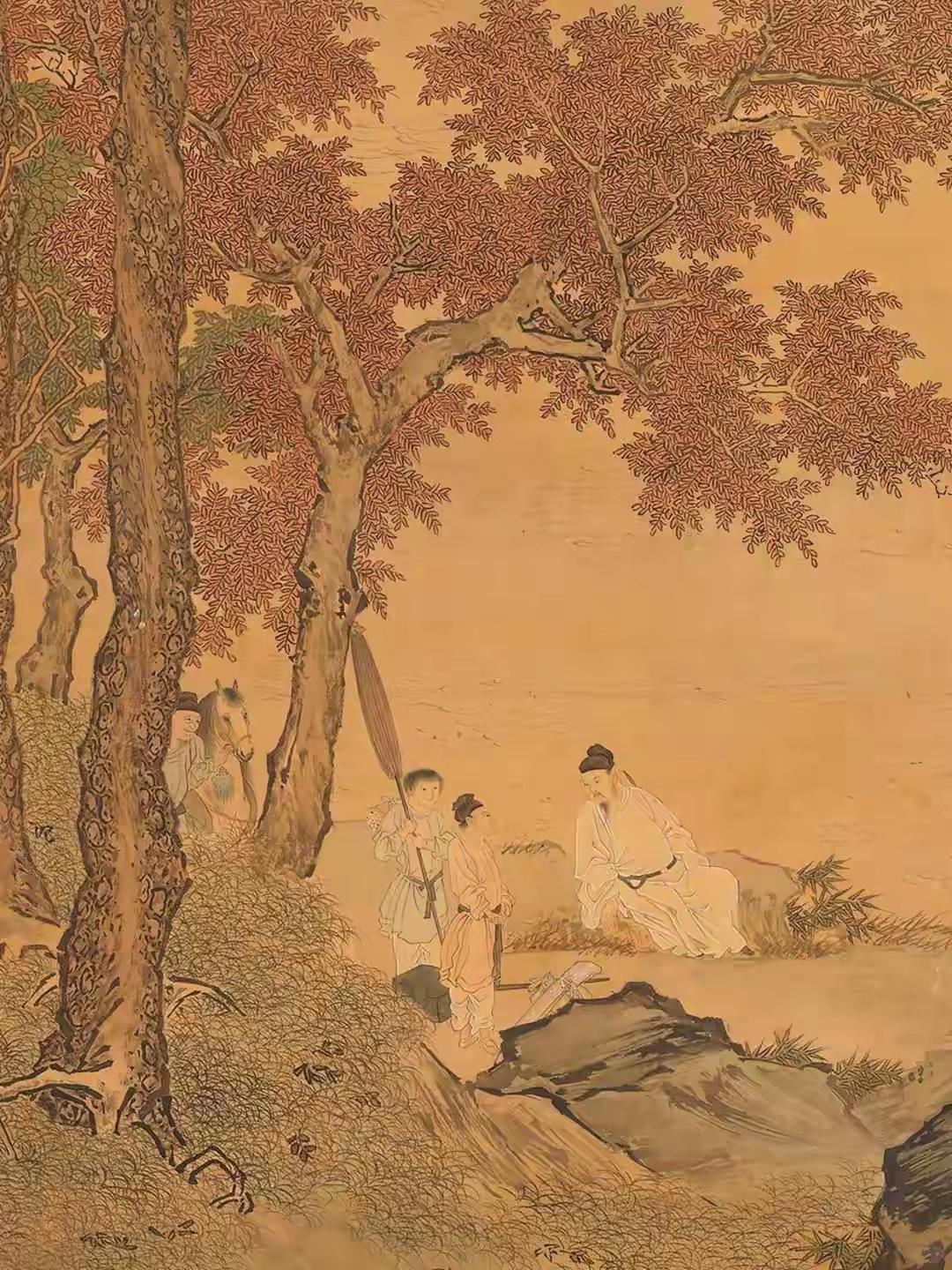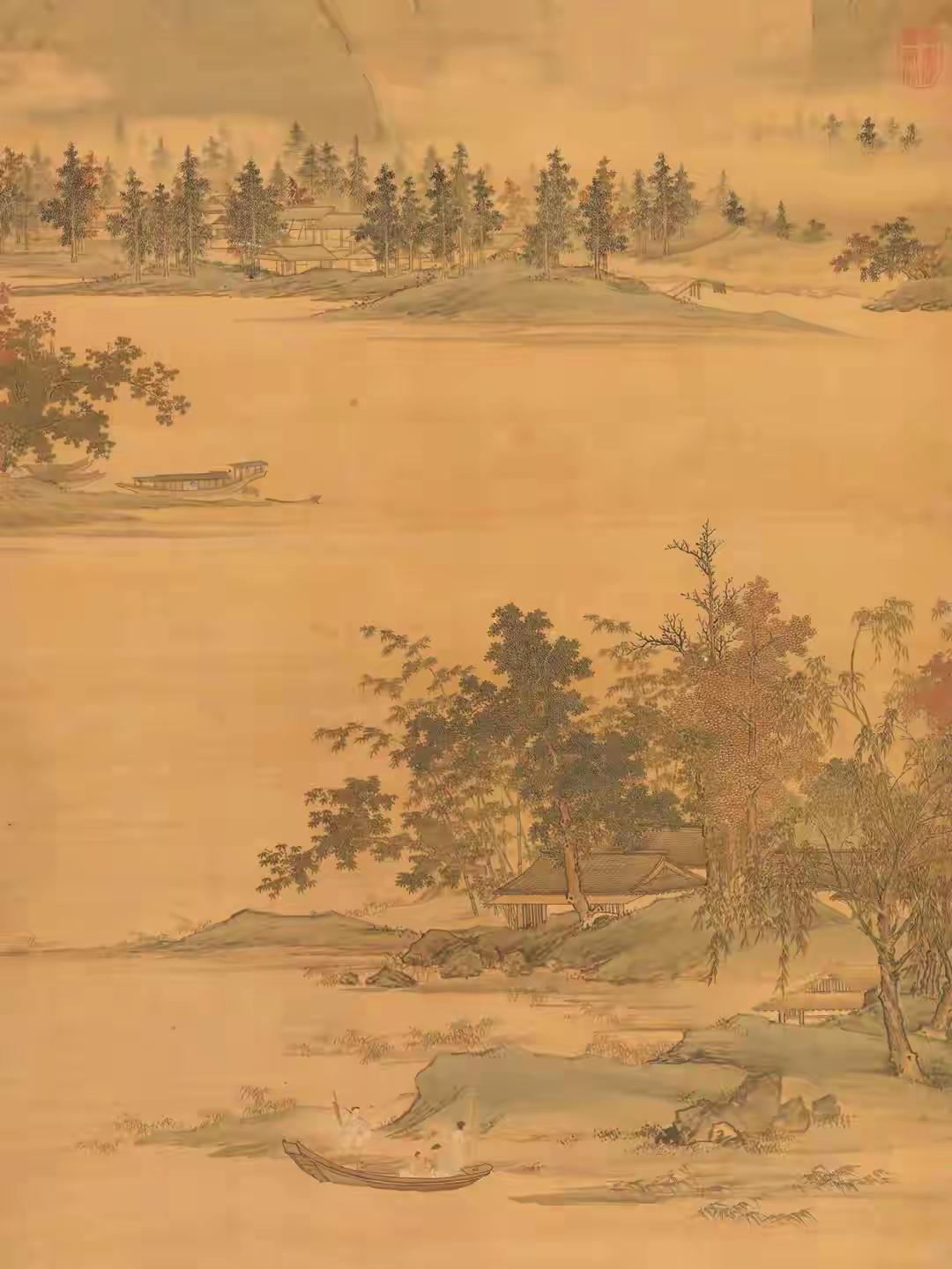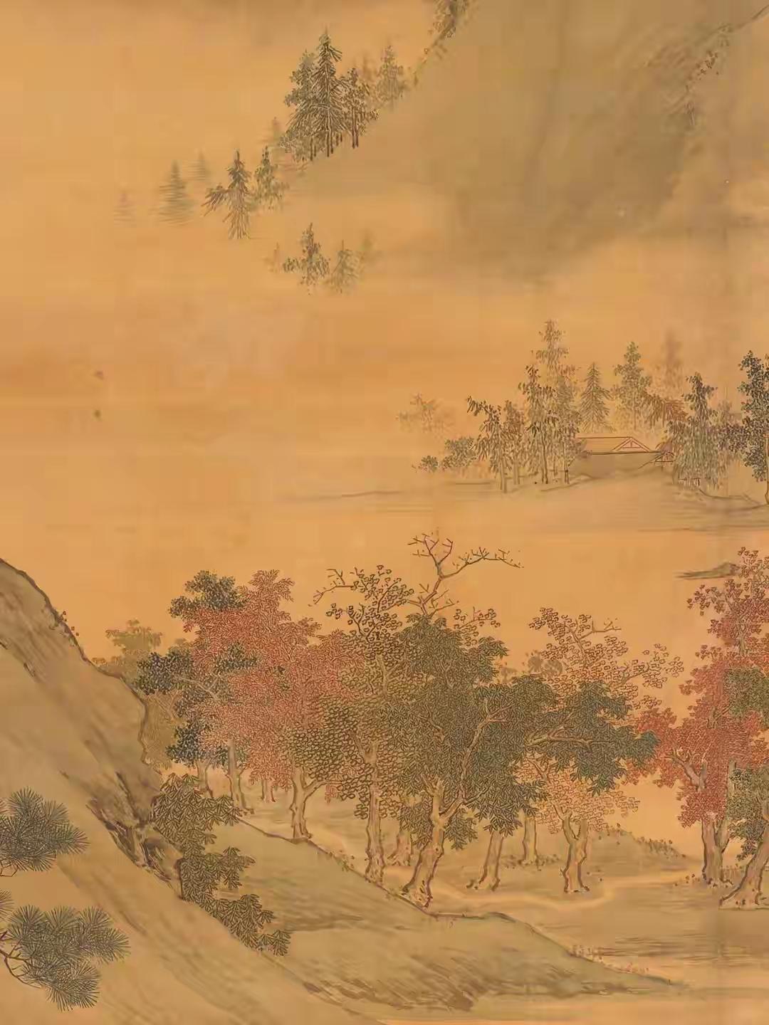 初见仇英《秋江待渡图》纯净版,心神为之凝驻。这位明代天才笔下,秋江澹荡,远山如沐,一叶孤舟静泊岸际,待渡人物衣袂翩然,神情顾盼间气韵生动。林木疏密有致,枝干以细笔勾皴,叶叶分明,仿佛可触其摇曳之姿。通幅设色清丽温润,浅赭、淡青与墨色交融,似有月光浸润其间。构图更见匠心,近水远岫,虚实相应,留白处似有无尽江风与秋思萦绕。仇英以工笔蕴写意,于精微中见广阔,非深谙古法而能独出机杼者,绝难至此境界,令人遥想其作画时,必是身心俱与笔墨同化于这派澄澈秋光之中了。