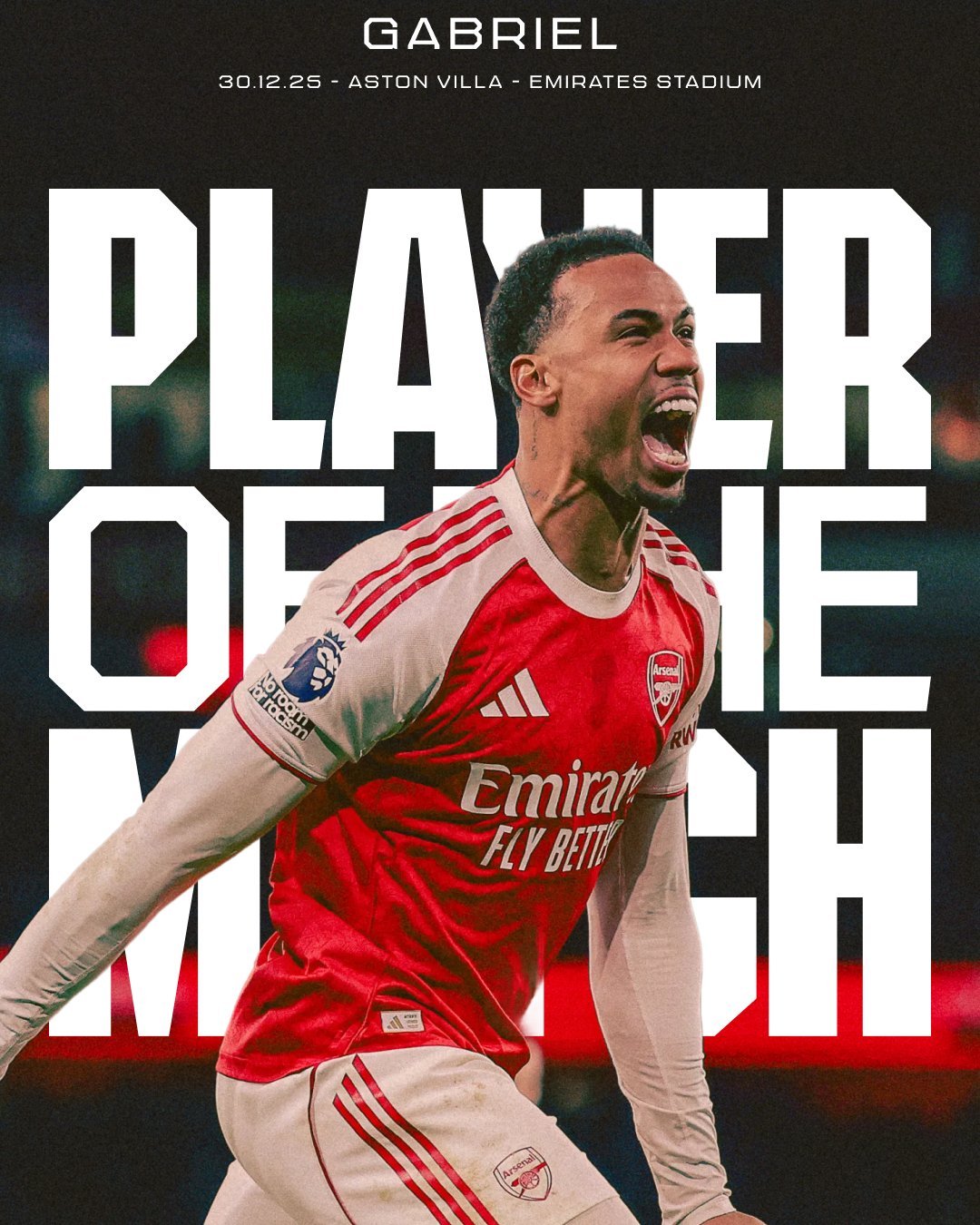 阿森纳官推:加布里埃尔被评为阿森纳vs阿斯顿维拉的最佳球员🏆英超联赛阿森纳