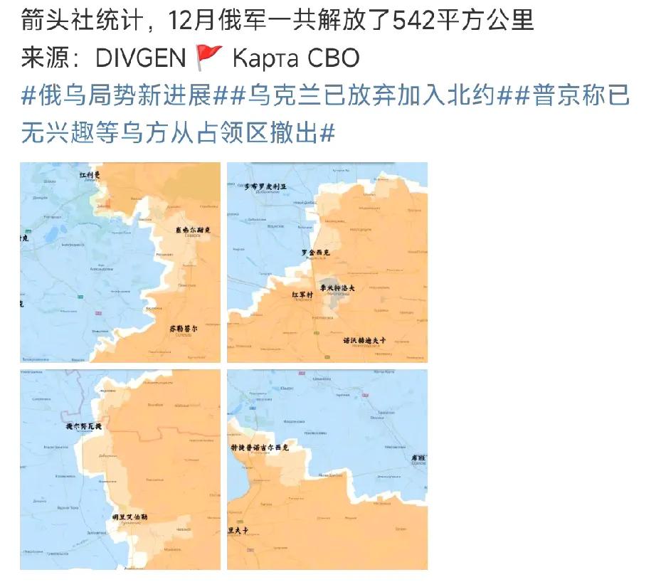 不管是12月占了700平方公里,还是542平方公里: 俄乌战争确实是一场本不该发生的斯拉夫人内战。 俄罗斯把曾经属于前苏的领土又拿了回去,但是,拿回去不等于永远拿走,只是暂时保管而已。 俄乌战争不会就此停息,即使停息也是暂时,因为俄罗斯的历史发展魔咒不允许俄罗斯停息。 此后,还会开战,开战后或者用不了多长时间那些领土又会再次回到乌克兰手中。