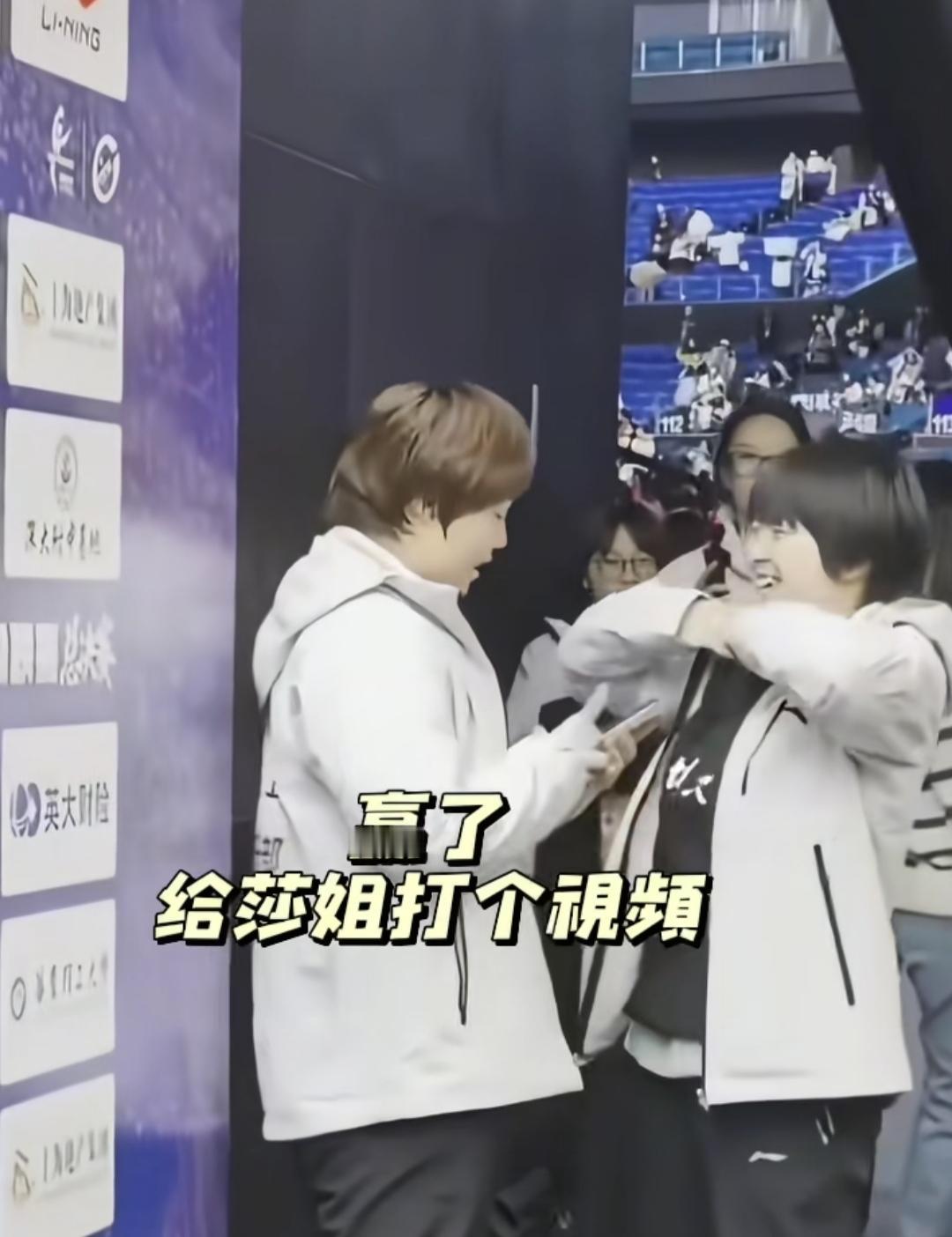 赢了,赢了,蒯曼拿出手机赶紧给莎莎打视频报喜! 乒超深大夺得冠军。后台小蘑菇和大