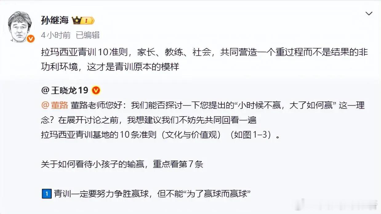 真敢说!孙继海首次点名董路,阐明3大核心立场,口水战继续升级最近一段时间,以董路、孙继海、王晓龙等中国足球人为代表,掀起了一场针对青训理念的大论战。因为理念的不同,著名媒体人董路与前国脚孙继海正式决裂,并且董路多次对孙继海的青训模式提出质疑。12月31日,孙继海罕见转发了一篇涉及到董路的社媒文章,阐明了自己在这场纠纷中的立场。孙继海转发的这篇文章,基本算是前国脚王晓龙对董路的“声讨檄文”,其中细致、逐条的批判了董路“足球小将”的青训模式,其中核心内容有三条:1、青训一定要努力争胜赢球,但不能“为了赢球而赢球”;2、“简单粗暴的赢球”会伤害孩子。3、短期赢球 ≠ 长期成才。长期能力积累才是重中之重,远远大于短期结果刺激。看得出,王晓龙这三条内容,可谓是打了董路的七寸,因为董路一直坚持的理念就是赢球大于一切、结果重于过程、身体重于技术。对此,孙继海给出了极高的评价:“拉玛西亚青训10准则,家长、教练、社会,共同营造一个重过程而不是结果的非功利环境,这才是青训原本的模样。”这不但是孙继海在社交平台上,首次点到董路的名字;也是借王晓龙之口,完成了对董路第一次真正意义上的反击。此前,在青训纷争的“骂战”中,一直都是董路或明或暗嘲讽质疑孙继海,而孙继海默不作声,似乎对此视而不见;而这一次,孙继海终于发声,既可看作是对董路的批评,也可看作是他将亲自下场参与“围剿”董路的前奏。可以预见的是,随着孙继海正式亮明立场,未来关于青训的这场“口水战”还将继续,甚至将再度升级。作为目前中国足坛的“顶流”,董路一直以言辞犀利和擅长“怼人”著称,想必对于孙继海,他不会善罢甘休。从这个角度来看,孙继海这次敢于下场“开撕”,还真是需要一定的勇气。
