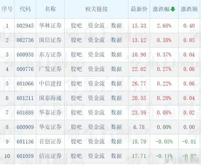 什么情况?今天头部券商股还挺争气的,仅七只券商股收红盘,其中就有五只是头部券商股,占比71.4%。今天涨幅第一的头部券商股国信证券收盘上涨0.38.%,是今年全年涨幅第三名的头部券商股。今天涨幅第二的头部券商股广发证券收盘上涨0.27%,是今年涨幅第一的头部券商股。其它三家只收红盘的头部券商股中信建投、国泰海通、华泰证券也是今年涨幅靠前的头部券商股。为了保卫胜利果实,这五只券商股也是拼了!