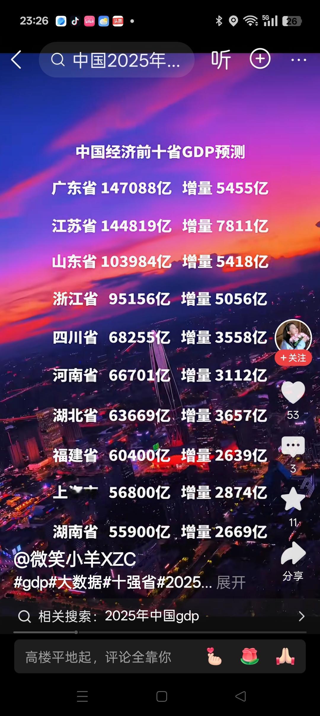2025GDP10强榜出炉了 根据最新预测结果,2025各省市区GDP10强榜(不含港澳台)出炉了。 不难看出以下几个端倪: 一是江苏GDP增量再次居首,由此,江苏与广东的差距又缩短了许多,照此趋势下去,过不了几年,江苏将会超越广东,把千年老二的帽子彻底摘掉。 二是十强层次分明,粤、苏、鲁、浙四大经济强省不管是总量,还是增量,显然均位居GDP第一阵容;余下的六个省市则位居第二阵容。且第二阵容与第一阵容的差距进一步拉大。 三是较上年排名,没有出现任何变化,表明经济大势较为平稳。