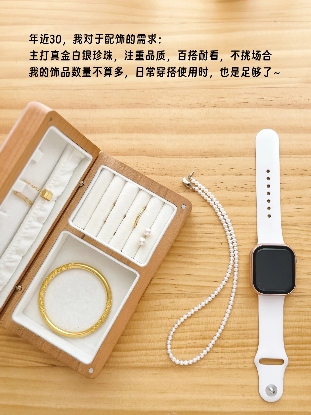 年近三十,我开始对配饰有不一样的需求: 比以前更加注重品质,选择真金白银珍珠,外观简单、大方、耐看 我的配饰平常穿搭的时候,我觉得这些也够用了 - ▪️古法手镯 ▪️小金砖项链 ▪️珍珠项链 ▪️素圈戒指 ▪️珍珠耳钉 ▪️手表 - 谢谢你的时间,下次见~ [红色心形R][红色心形R][红色心形R] 我是精简生活,一心搞钱,百万退休计划 消费观:能挣会花|善于思考|清醒败家 让我们一起成为自己的大女主,早日退休🎉
