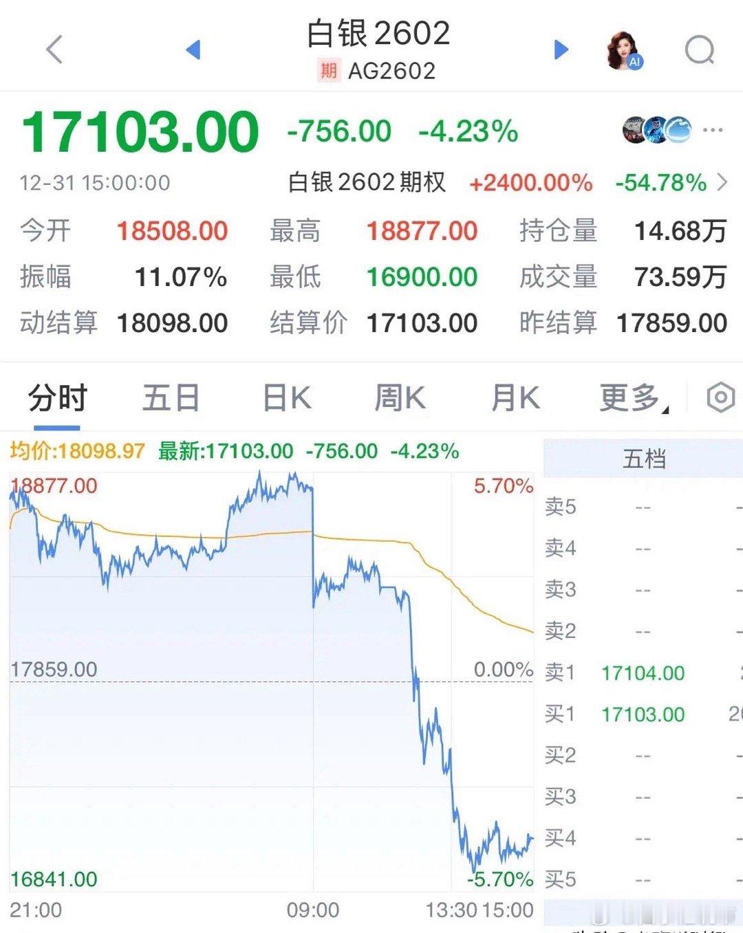 白银和黄金今天为何暴跌,普通人不要去短线投机:白银暴跌!2025年12月31日今天白银又暴跌4.23%,从涨六个点到跌五个点,追高的投资者一天亏十几个点,比股票还刺激,风险还大。基本上都见顶了,普通人就不该去短线投机。白银暴跌表面原因是期货交易所干预,实际上是资金短线爆炒后暴跌。还有小白去买白银LOF,也暴跌,三四天暴跌30%,因为高溢价。短线追涨必然亏钱,又不是ETF能T+0,所以2026年投资者不要去折腾了,黄金和白银都在高位震荡了。