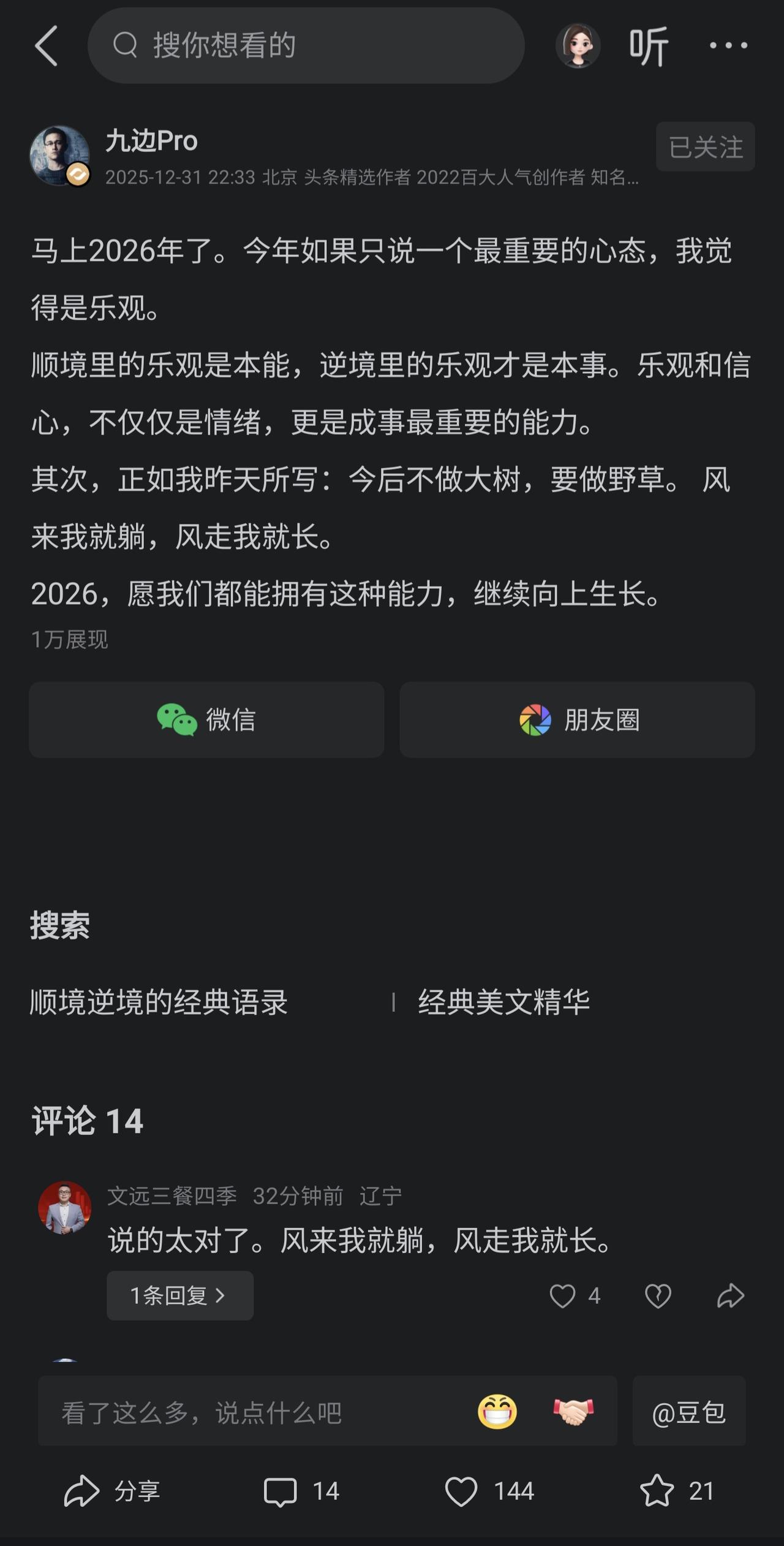 九边pro:2026年最重要的是保持心态乐观。 非常同意九边的这句话,乐观是一种非常强大的力量,我们从小学习马克思主义哲学,知道意识对物质具有能动的反作用,积极的意识可以推动物质的发展。 就我们普通人而言,在工作和学习中,也可以体验到乐观尤其是在逆境中的乐观对成事的重要性,比如说我今年开始做自媒体创作,刚开始爆文后给我极大信心,结果接下来这一段时间一直写不出爆款,如果你悲观看待的话,可能就坚持不下去,但是我相信久久为功,功不唐捐,我深信道路是曲折的,但前途是光明的。 如何有乐观的心态?我给大家分享两个方法。 一个是南环瑾大师说过的话: 看世界上任何的东西要轻松,不要严重。 我们的心脏只有拳头那么大,装不了多少东西的,痛苦、烦恼、得意都要丢出去。 另一个是三傻大闹宝莱坞里的一句台词: 心很脆弱,你得学会哄它,不管碰到多大的困难,告诉你的心“All is well ( 一切都好) ”。 写这篇微头条时已经是23:25分,马上到2026年了,如同九边所说,希望大家在2026年都有乐观的心态。